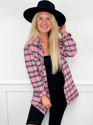 Be the envy of every girls night with our Every Night's Girls Night Long Sleeve Pink Flannel. This trendy top features a plaid design and a released bottom hem for added style. And with our exclusive label, you won't find this anywhere else!