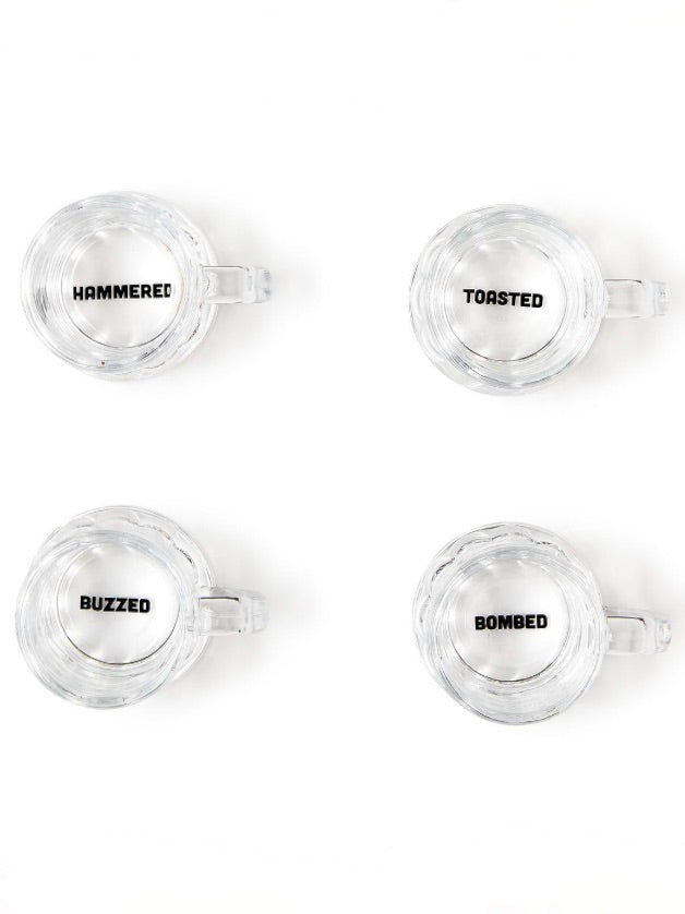 Get the party started with this hilarious Mini Mug Shot Glass Set! Each of the four 2 oz. glasses features a cheeky drink marker at the bottom—Buzzed, Toasted, Hammered, and Bombed—so your guests always know exactly where they stand. Perfect for shots, samples, or fun gatherings with friends. Mix, match, and laugh your way through the night with this playful addition to any bar collection.