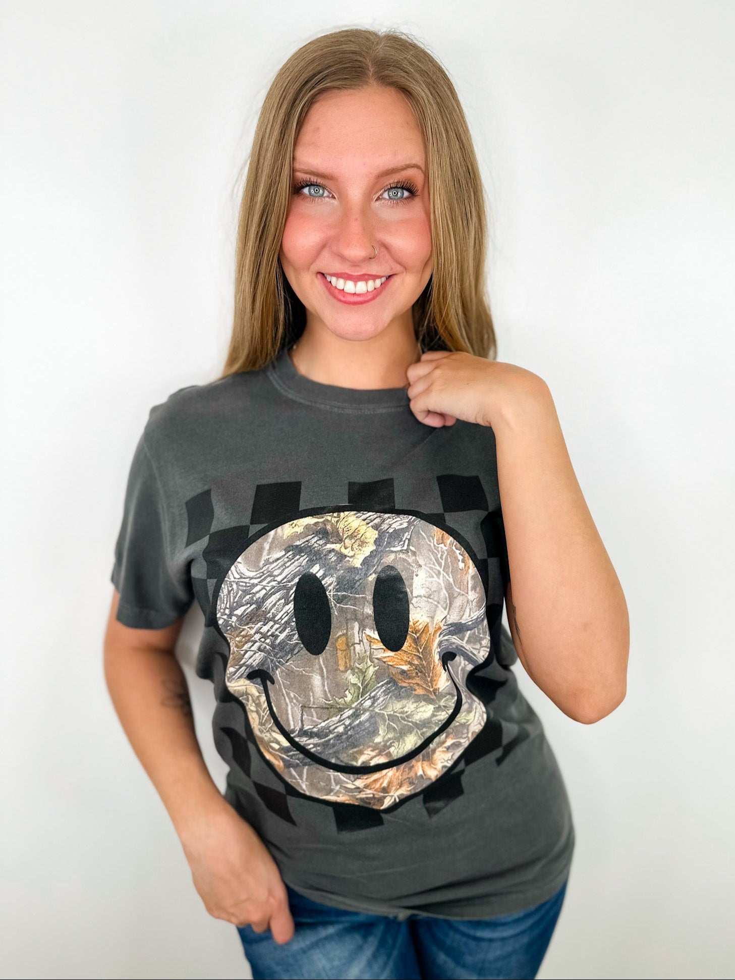 This Checked Happy Cotton Short Sleeve Charcoal Avery Mae Graphic Tee is your new go-to for any day! Soft, comfy, and effortlessly cute, it’s perfect for layering in fall or wearing on its own when the sun’s out. Add a little happy to your wardrobe with this playful, easy-to-style tee.