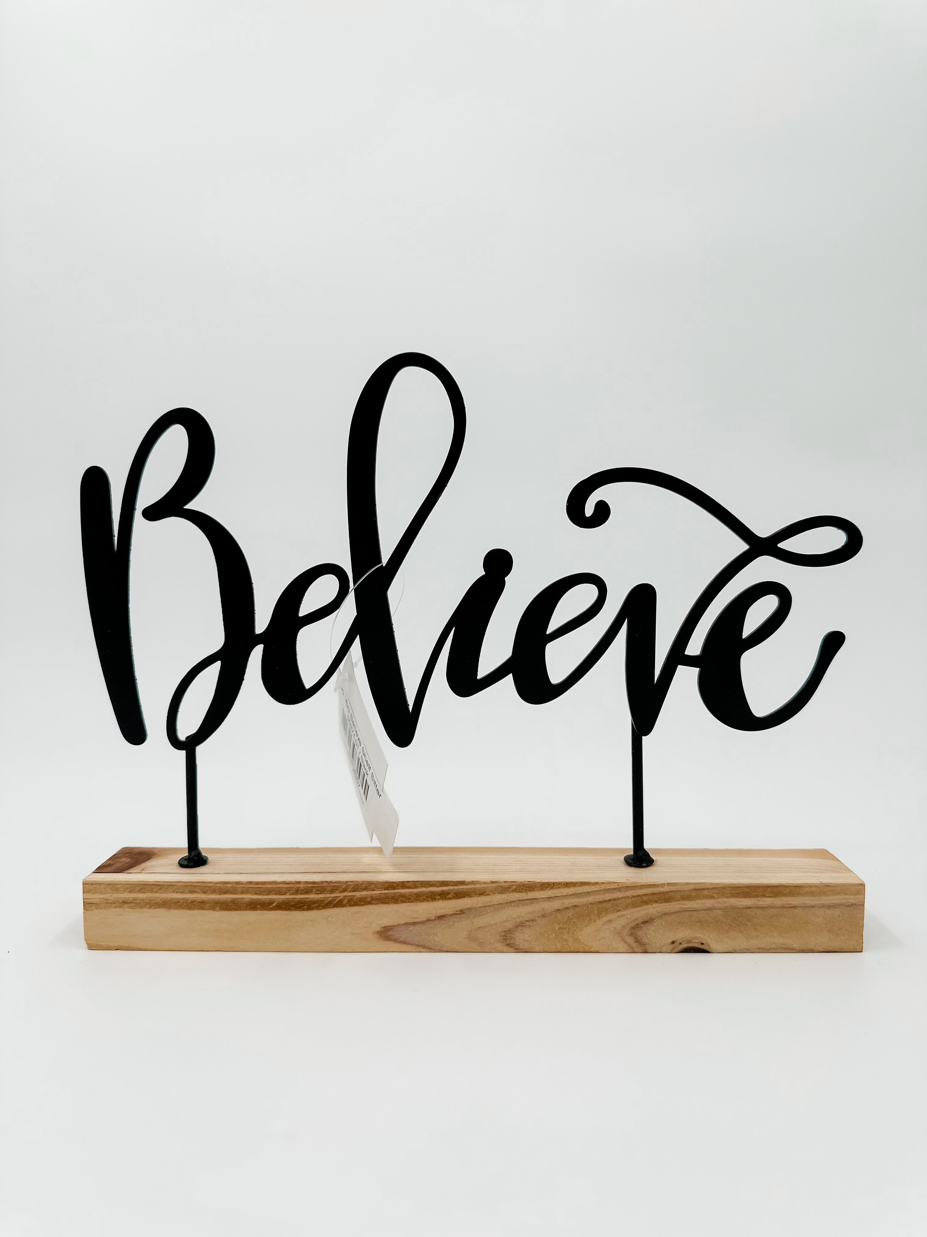 Add a touch of inspiration to any room with the Do You Believe Shelf Sitter. This charming metal sign, featuring the hand-lettered word "Believe," stands proudly on a natural wood base. Perfect for seasonal decoration or everyday motivation, it can easily free-stand on shelves, desks, or mantels. Let this playful piece remind you to embrace positivity and hope wherever you place it!