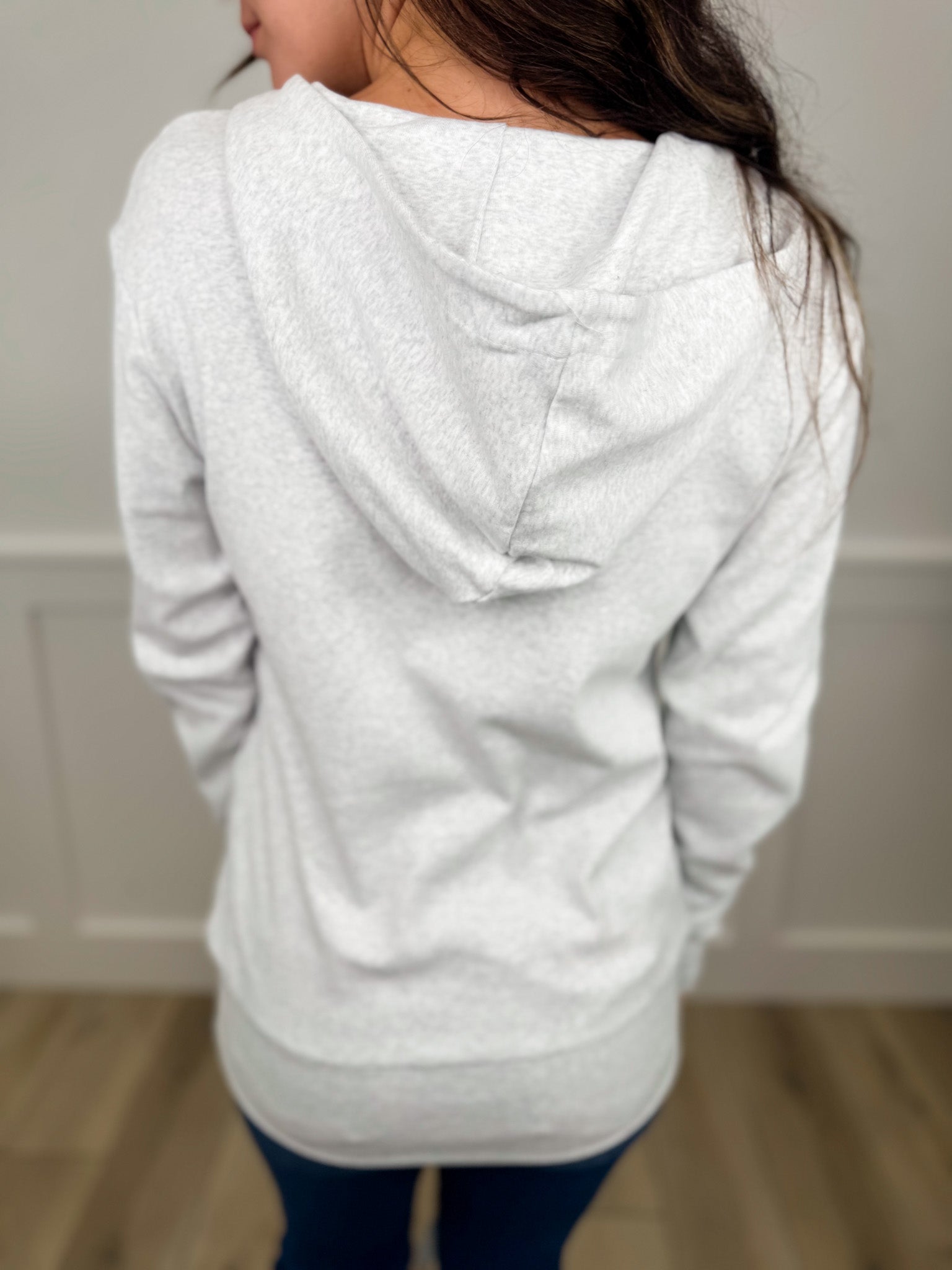 Enjoy cozy days in this playful heathered grey hoodie made from a soft cotton blend. Thumb holes add a fun, practical touch, while the gold zipper and pull bring a pop of sparkle to your casual style. Perfect for lounging or light adventures with a cheerful twist.