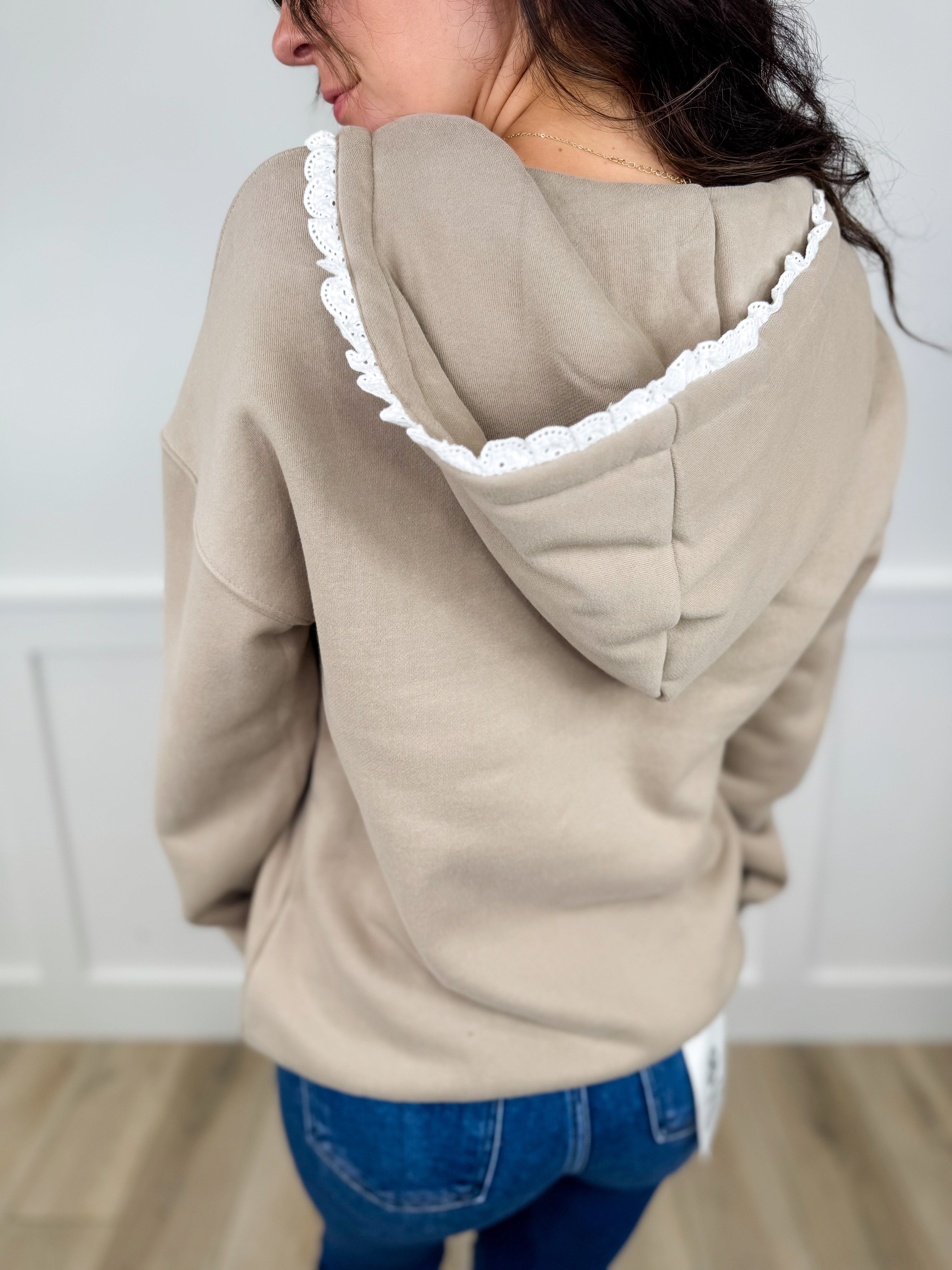 Cozy up in this playful half-zip hoodie featuring a soft fleece lining and roomy kangaroo pocket—perfect for keeping your hands warm or stashing little treasures. The delicate lace details add a sweet touch to the comfy cotton blend fabric, making it your new go-to for laid-back days with a fun twist.