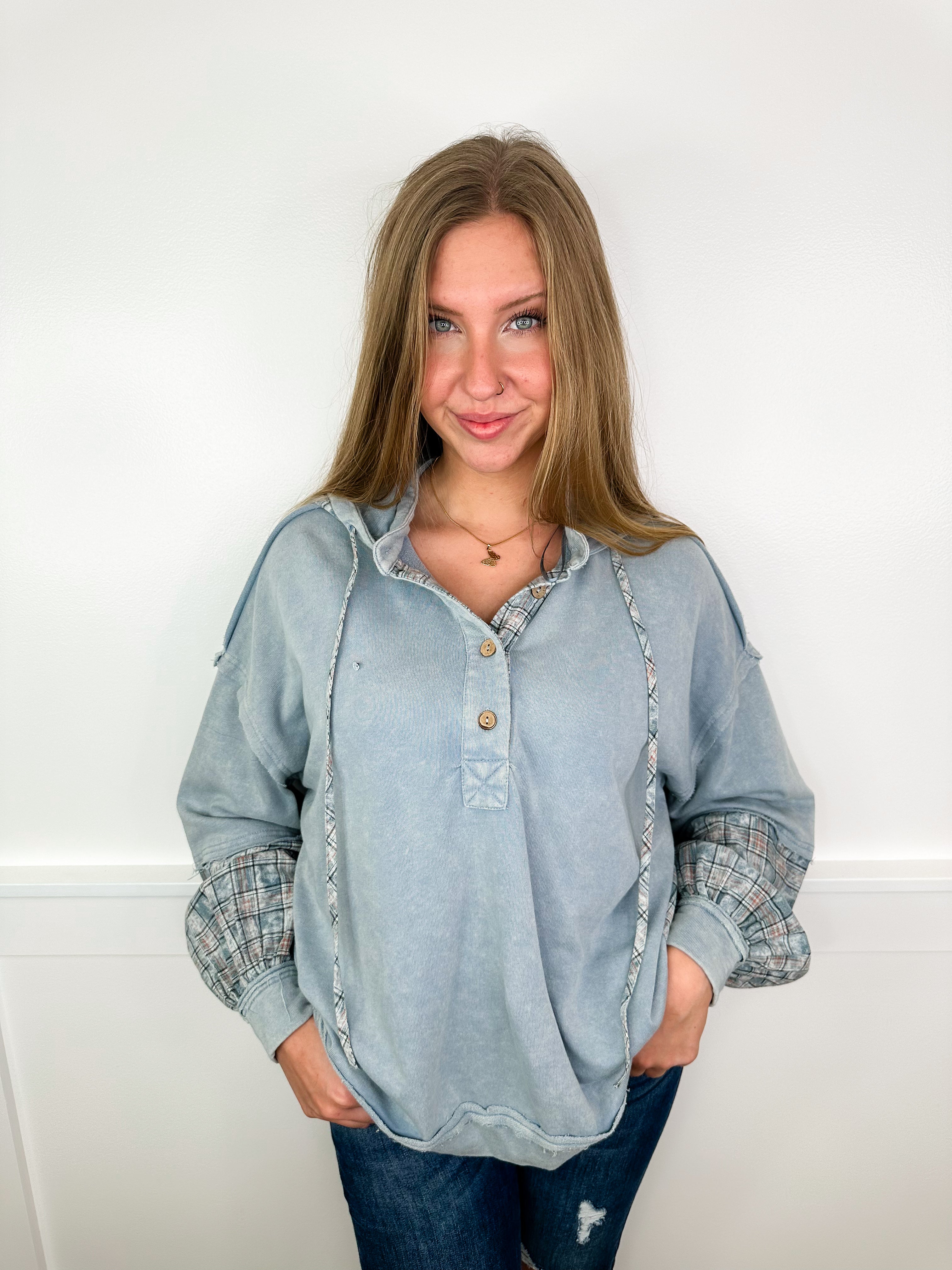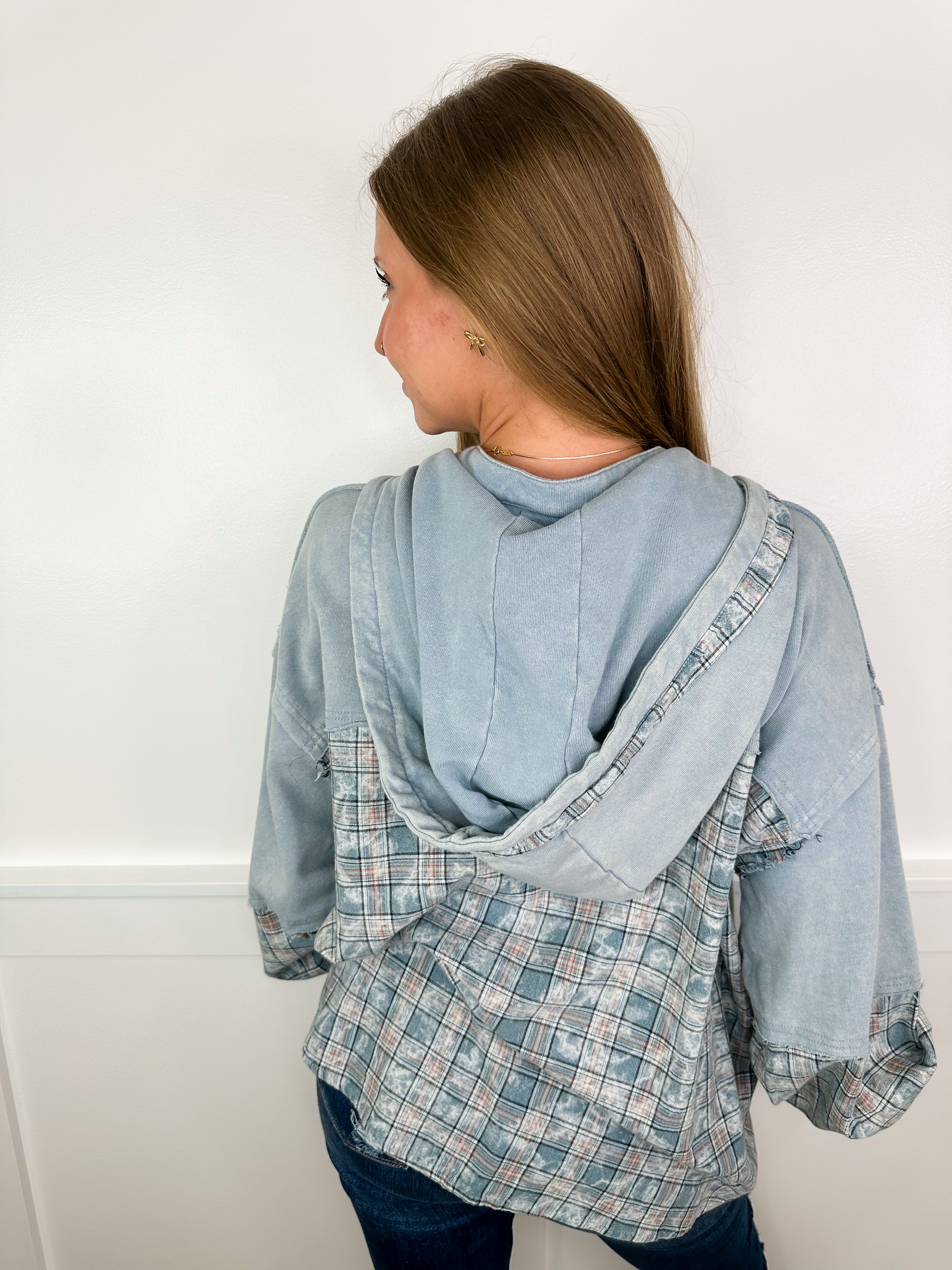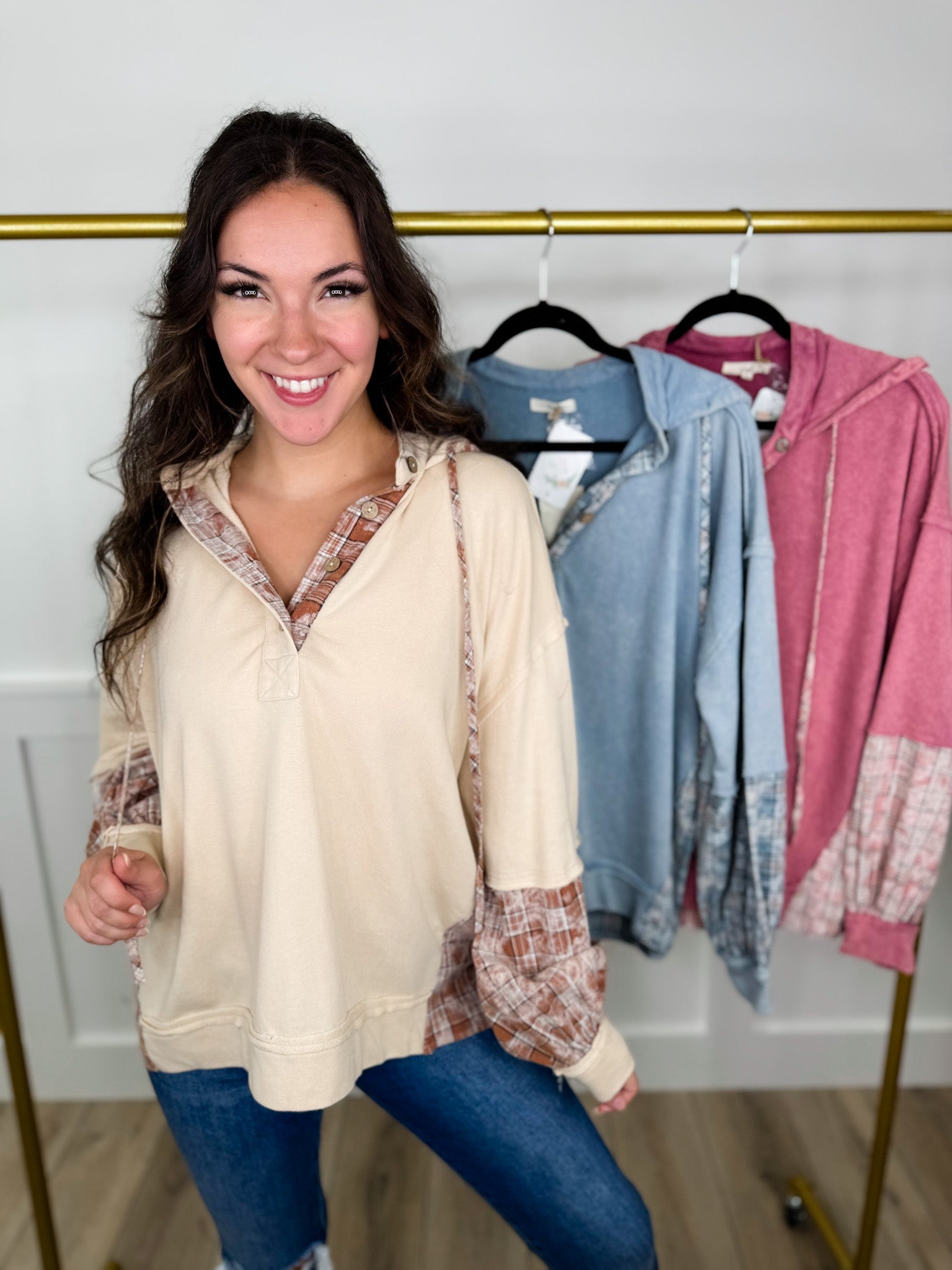 This playful long-sleeved hooded top combines cozy cotton comfort with a fun flannel twist. Featuring a cute flannel back and charming flannel accents on the front, it’s the perfect must-have for adding a touch of casual flair to any day. Available in two colors, this top effortlessly blends style and comfort for your everyday adventures.