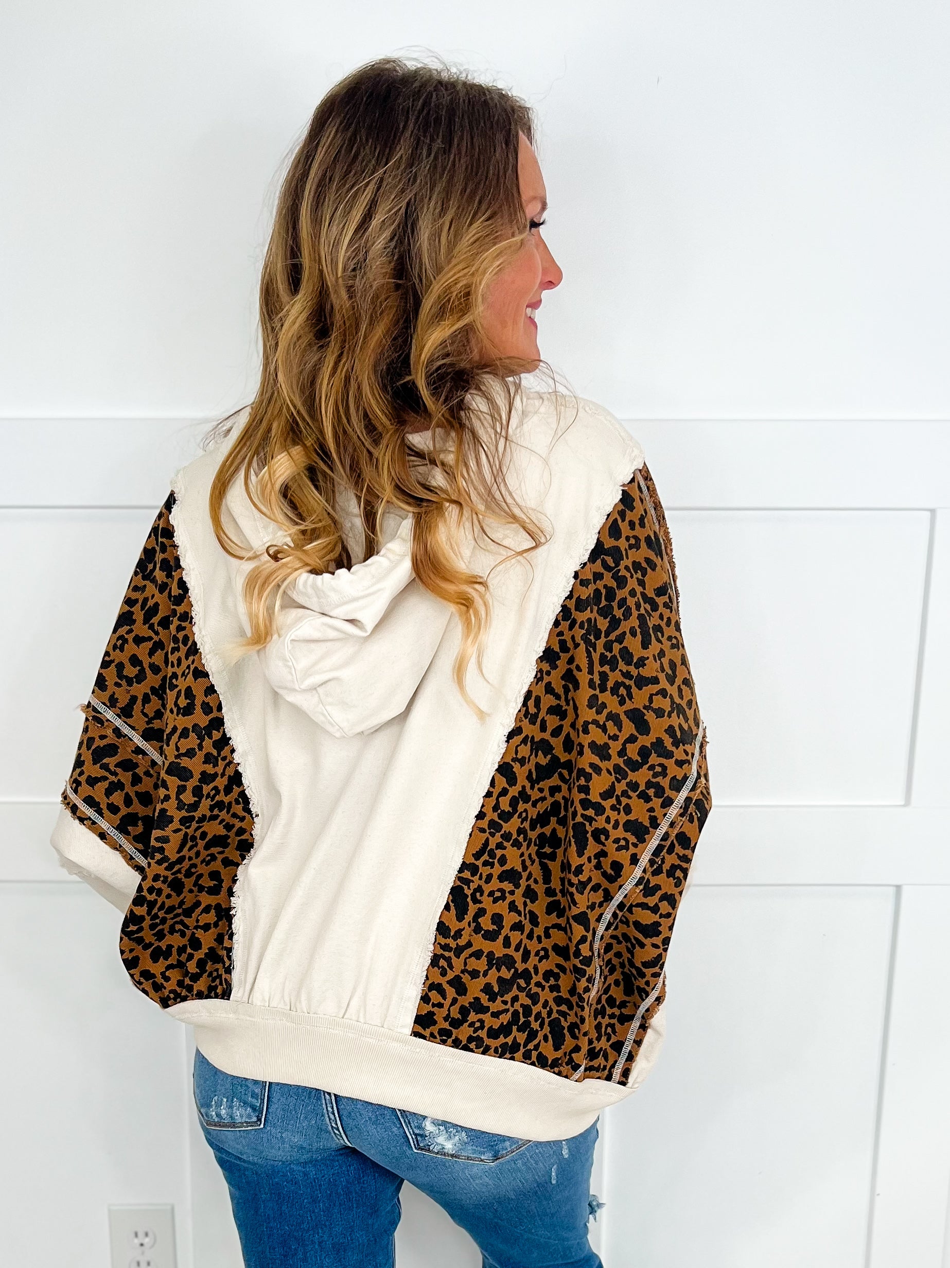 Take a walk on the wild side with our Looks Identical Cotton Long Sleeve Cream Avery Mae Full Zip Hoodie Jacket! Featuring a unique combination of cream and leopard print, this oversized jacket is perfect for layering and making a statement. Stand out while staying cozy in style!