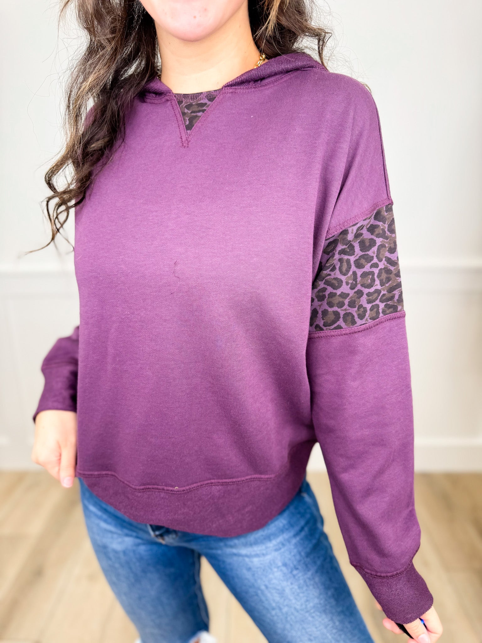 Stay cozy and effortlessly stylish in the Maybe I Will Knit Long Sleeve Avery Mae Hooded Top. This lightweight hoodie features playful leopard print accents at the neck and sleeves, adding just the right touch of fun to your casual look. With its relaxed fit, it’s perfect for lounging or layering on cooler days. Available in two colors, it’s a cute essential that combines comfort with a hint of wild flair.
