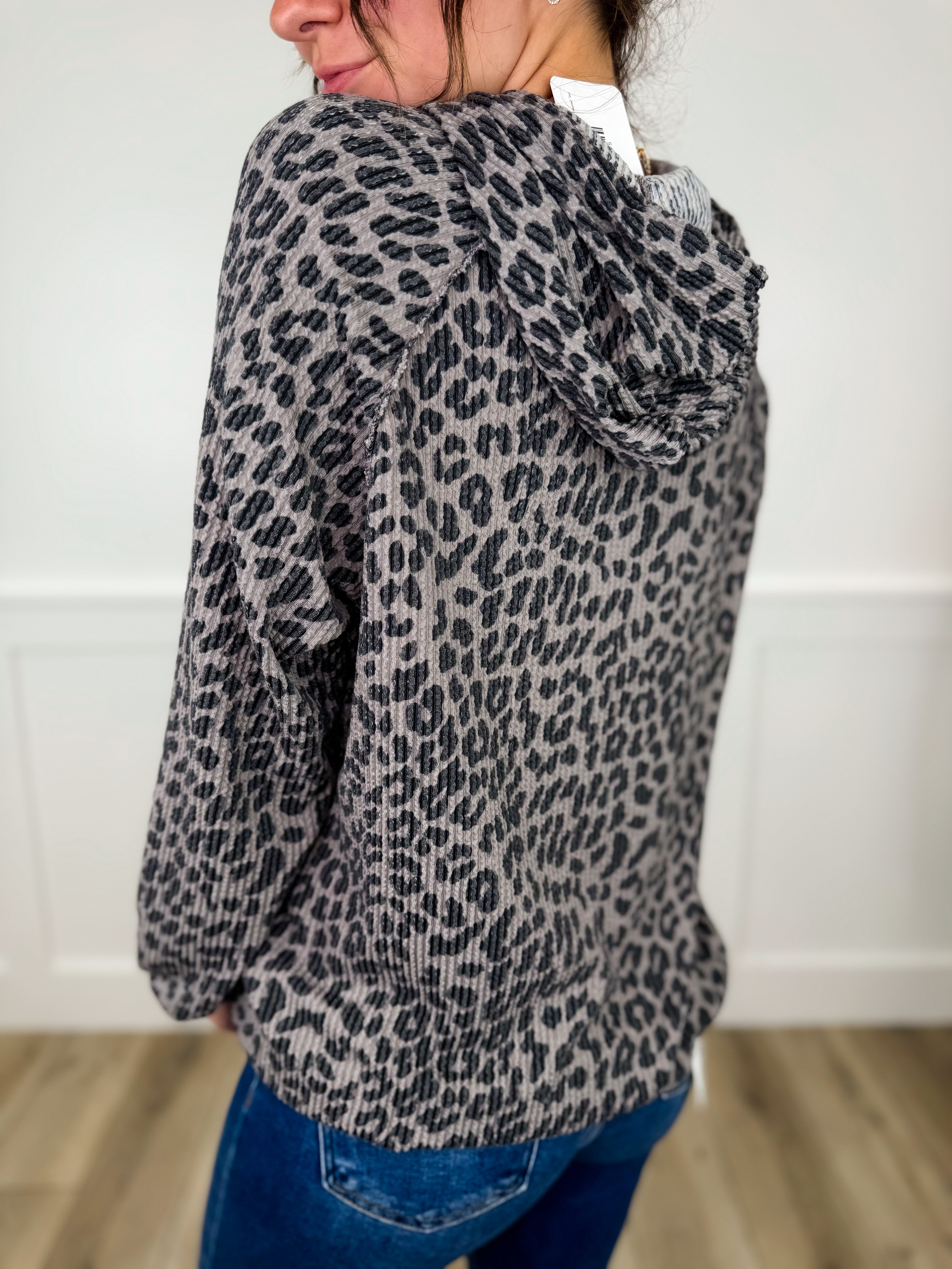 Cozy meets wild in this grey leopard print hooded top! With a relaxed fit and lightweight ribbed fabric, it’s perfect for layering or lounging with a touch of playful flair. Whether you're out and about or chilling at home, this top keeps comfort front and center while turning heads.