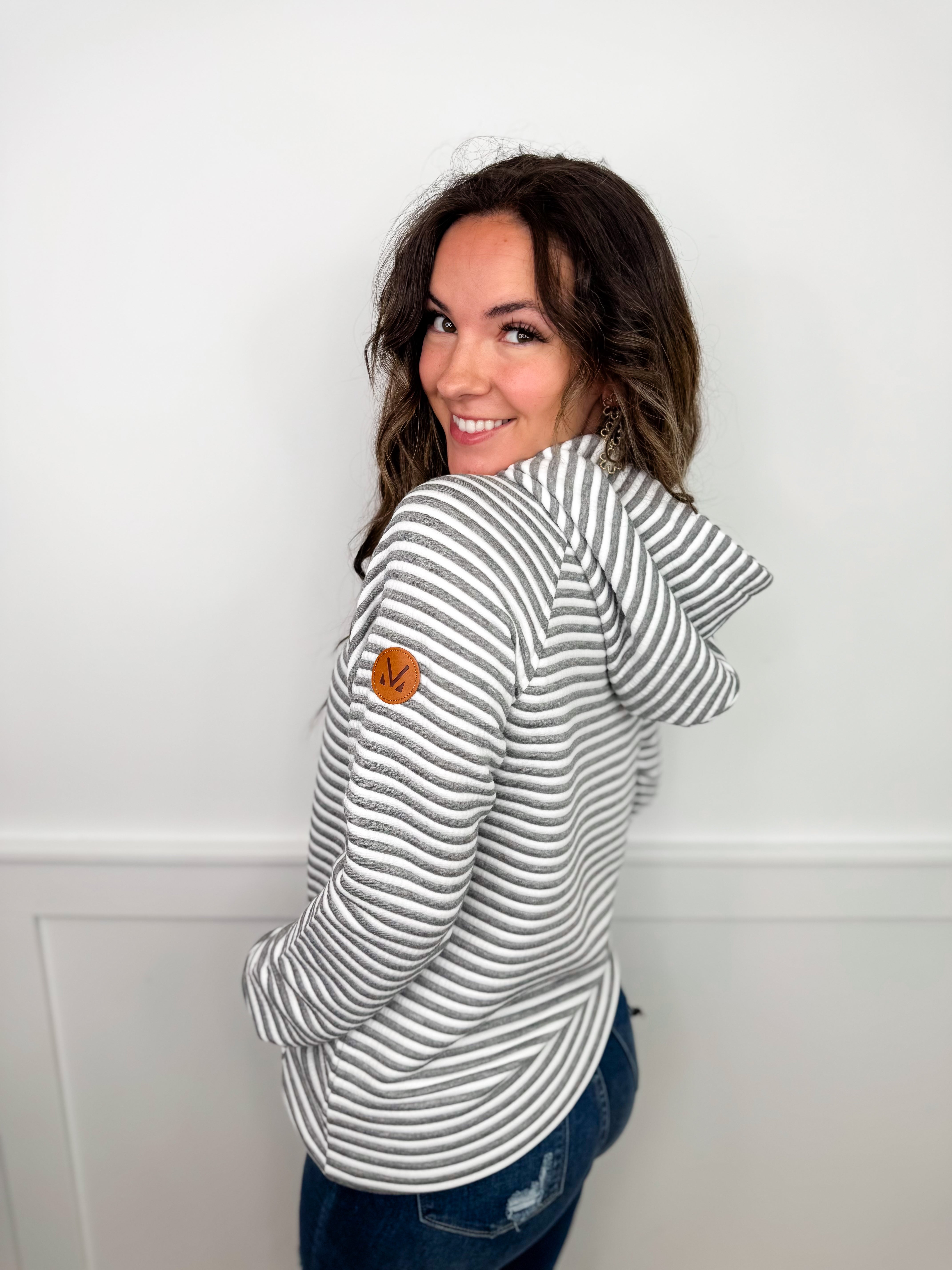 Cozy up in the Straight Ahead Long Sleeve Grey Avery Mae Hooded Sweatshirt, featuring a textured knit striped design that adds a fun twist to your everyday look. Perfect for comfort and casual wear, this hoodie keeps you stylishly snug whether you're out and about or relaxing at home.
