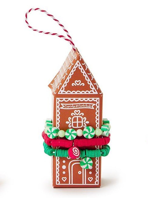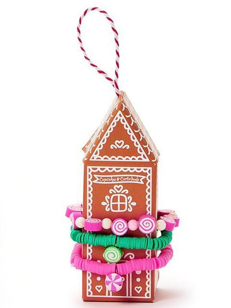 Bring holiday cheer to your wrist with this playful set of three peppermint candy elastic bracelets, packaged around a cute gingerbread house gift box. These colorful, stretchy bracelets add a whimsical touch to any outfit and make a sweet gift for the festive season. Available in four fun options to mix, match, and jingle all the way! | For ages 3+.