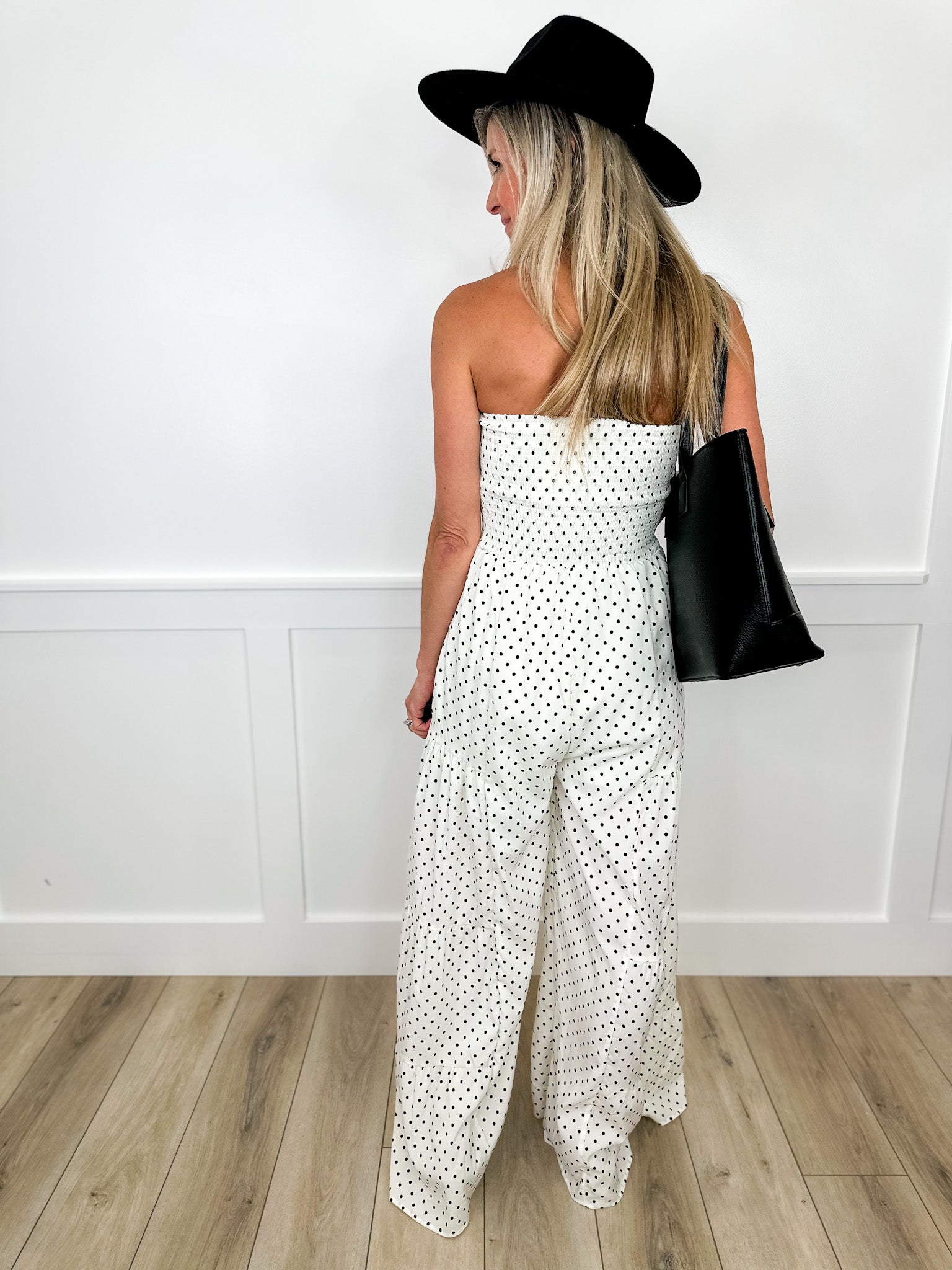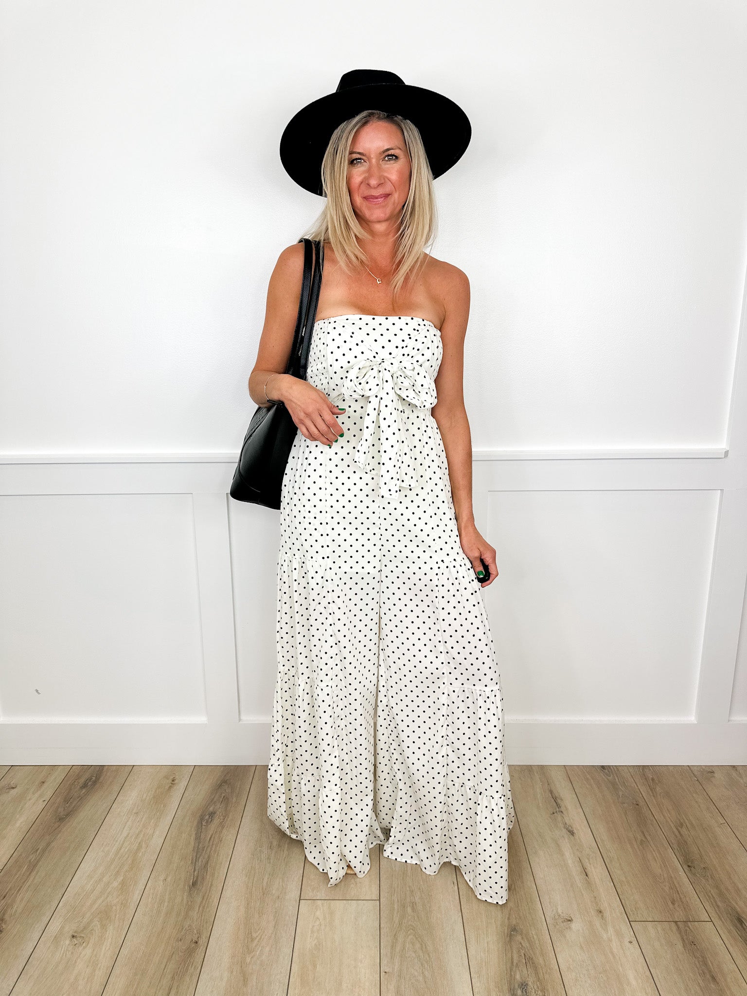 Steal the spotlight in this strapless jumpsuit featuring charming polka dots, a flirty front bow, and flowing wide legs. The lightweight cream fabric moves beautifully with you, making it perfect for any occasion where you want to feel fabulous and fun.