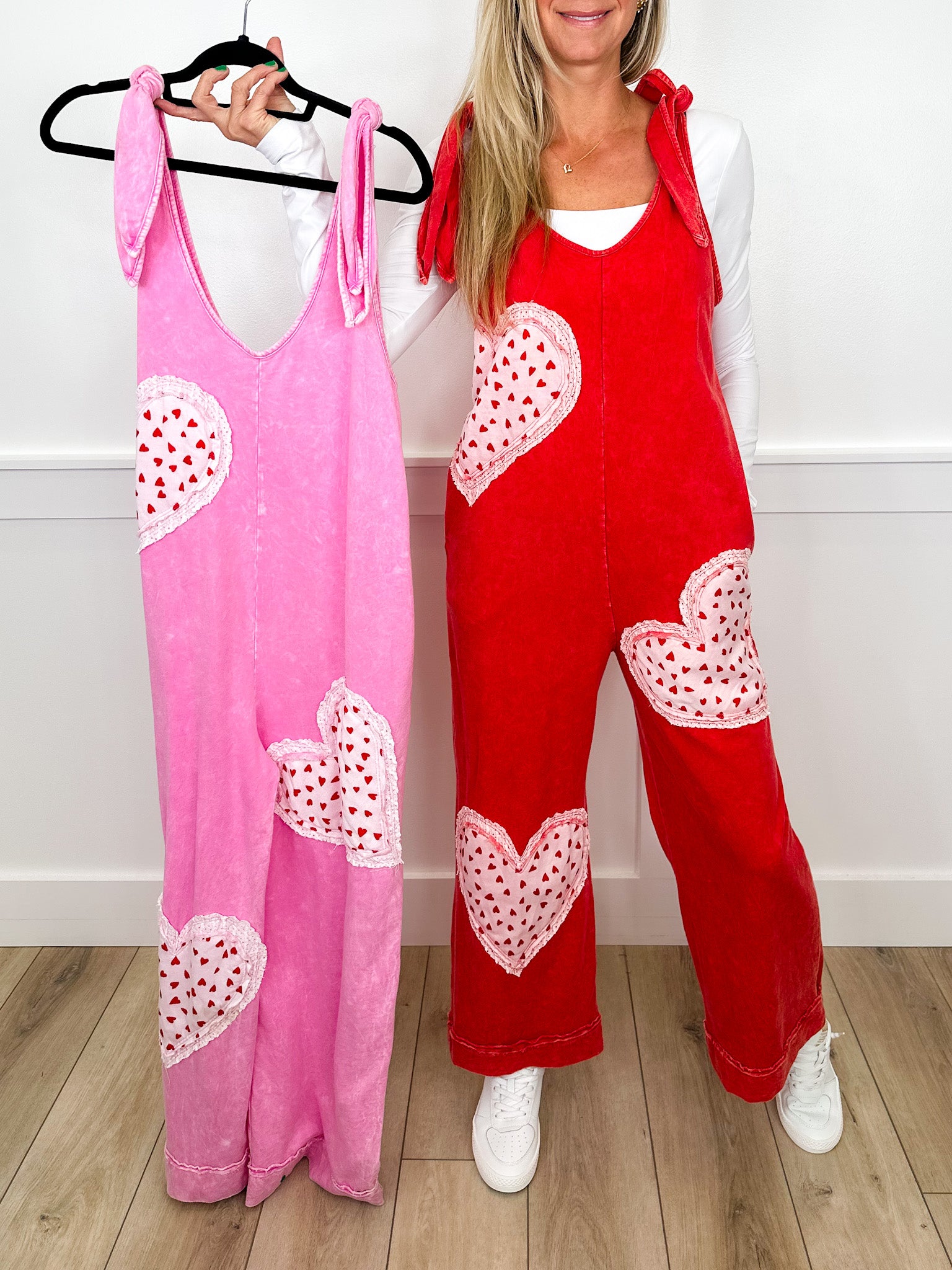 Float through your day in this adorable cropped jumpsuit that's equal parts comfort and style! Crafted from soft, mineral-washed cotton, it features a functional shoulder tie that lets you customize your fit and show off those shoulders. Sweet heart patches add a charming touch perfect for spreading Valentine's vibes year-round. Available in two gorgeous colors, this piece is your go-to for casual outings, date nights, or whenever you want to feel effortlessly cute.