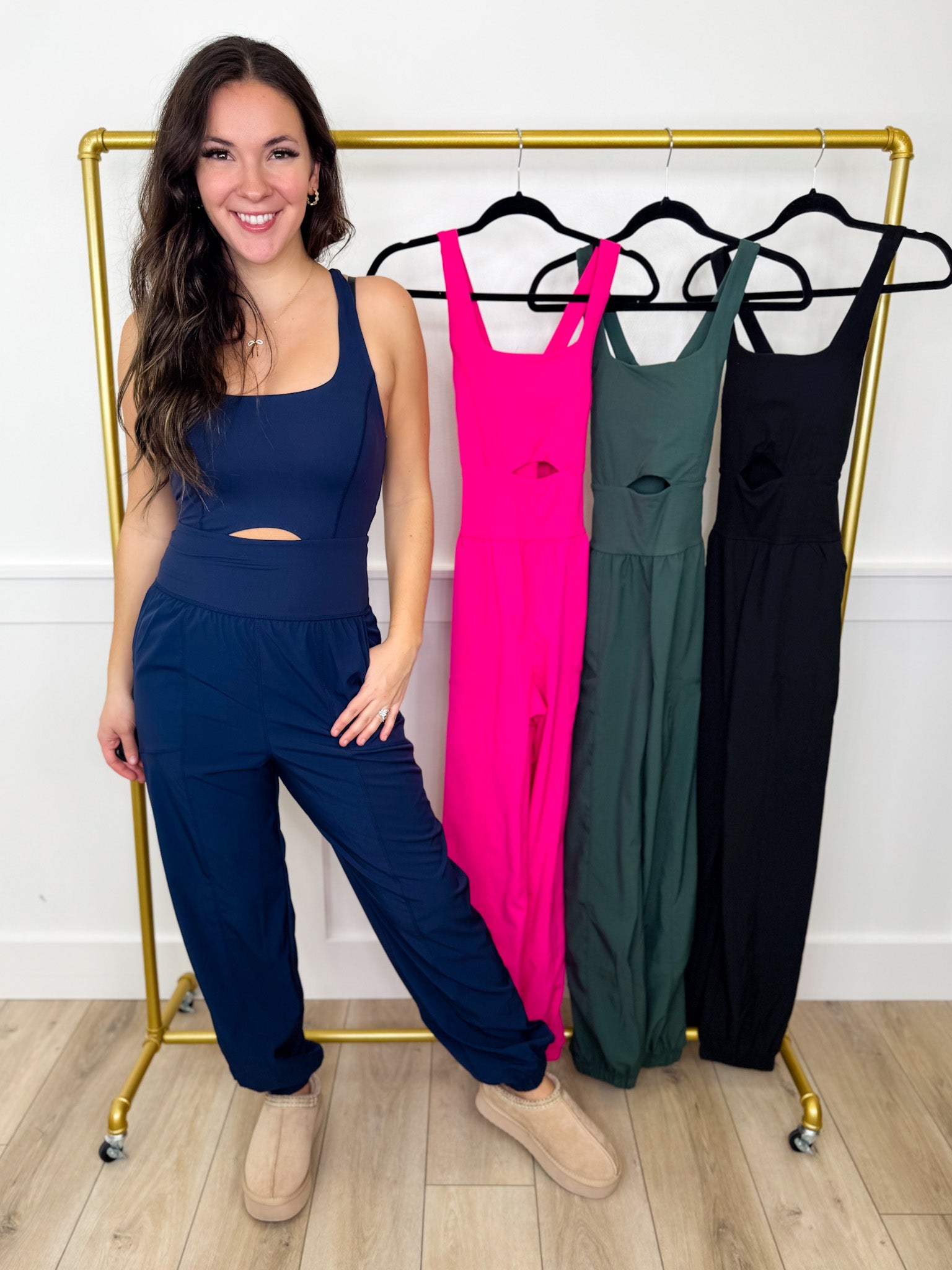 Get ready to turn heads in this playful jumpsuit that's as comfy as it is cute. The top features a luxuriously buttery soft fabric that feels amazing against your skin, while strategically crossed back straps add just the right amount of sass. The bottoms are crafted from lightweight windbreaker material that keeps things breezy and breathable—perfect for staying cool whether you're on the move or standing still. Choose from four stunning colors to express your vibe.