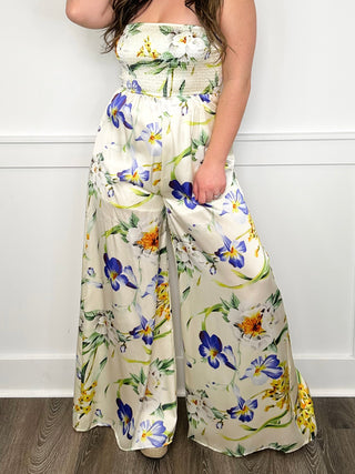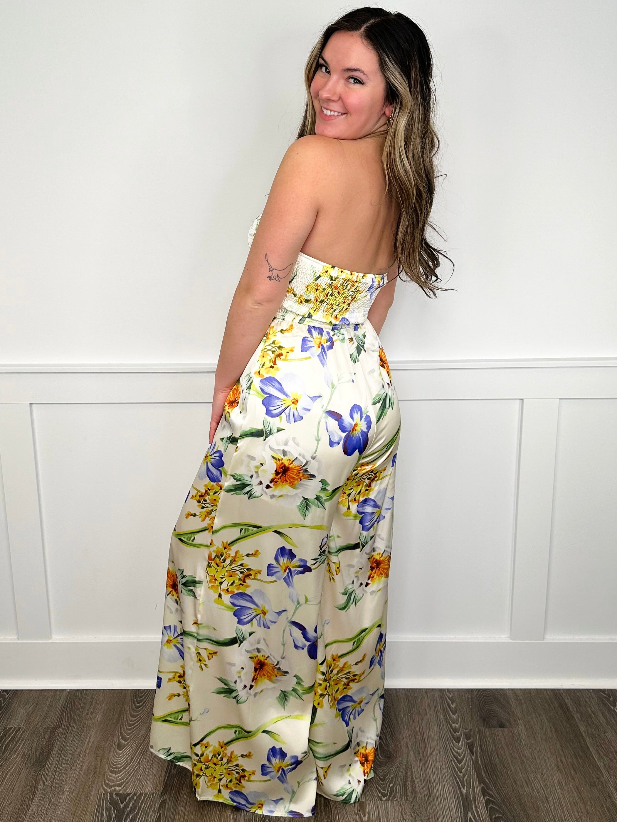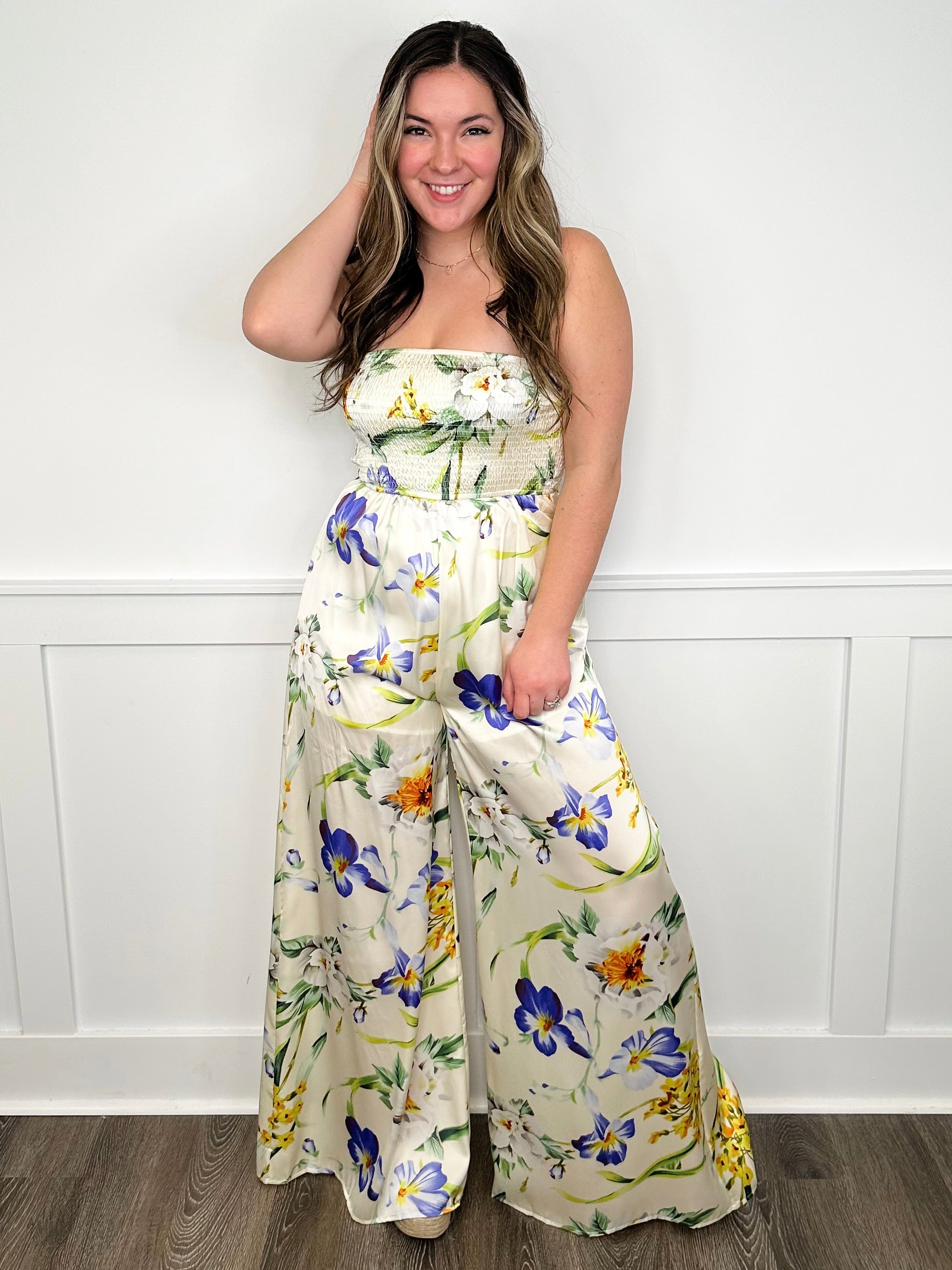 Unleash your true elegance with the That Feeling Satin Cream Avery Mae Jumpsuit. Featuring a subtle floral print and complementary colors, this jumpsuit is the perfect blend of beauty and comfort. Embrace your playful side with this outfit choice!
