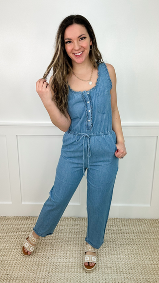 Look effortlessly cool in our White Birch Caught in the Moment jumpsuit. Made from light wash denim, this jumpsuit features functional buttons, a drawstring waist for the perfect fit, and playful ruffles around the neckline and sleeves. It's the perfect addition to your casual wardrobe.
