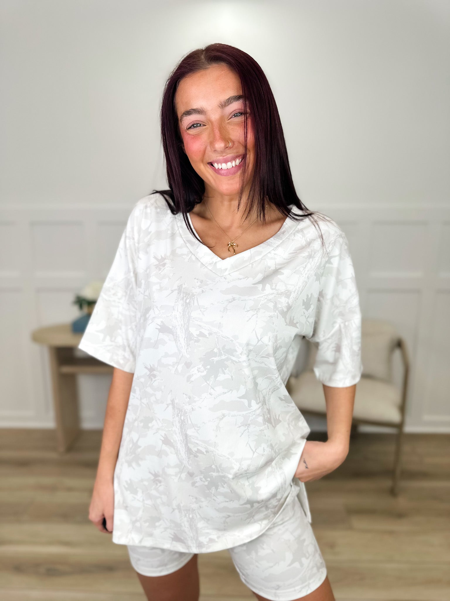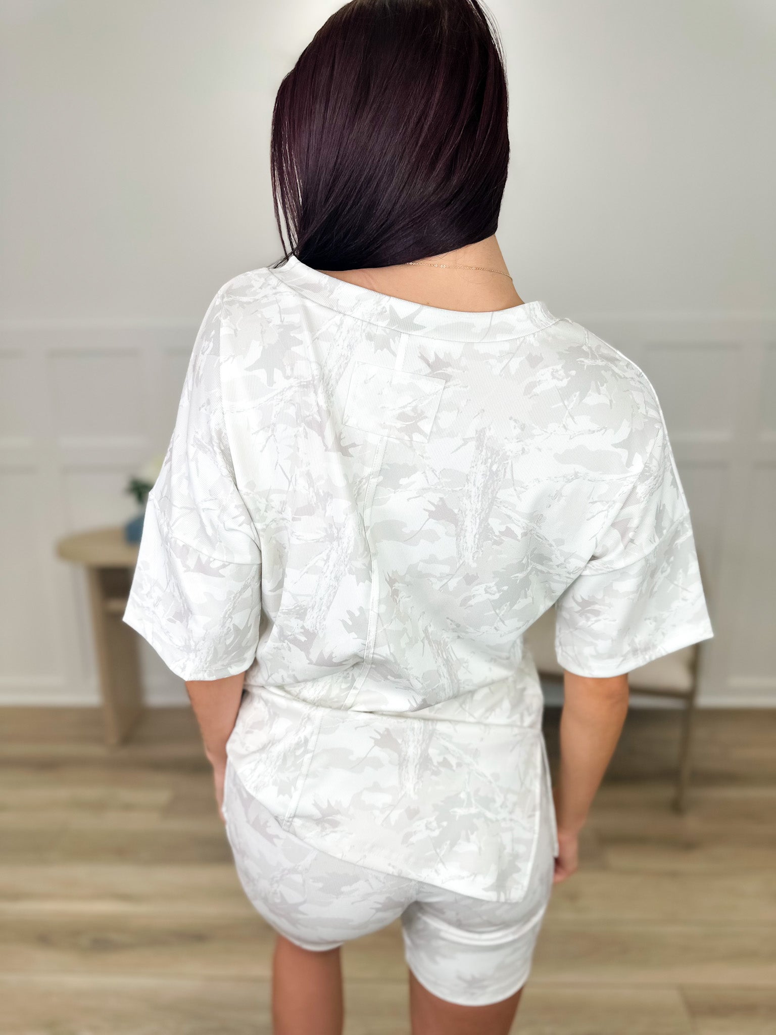 Throw on this effortless two-piece and you're ready for anything. The oversized short-sleeve top pairs perfectly with high-rise biker shorts, both featuring an eye-catching ivory and camo pattern that works harder than you do. Comfortable, stylish, and unapologetically bold—this set proves you don't have to choose between looking good and feeling great.
