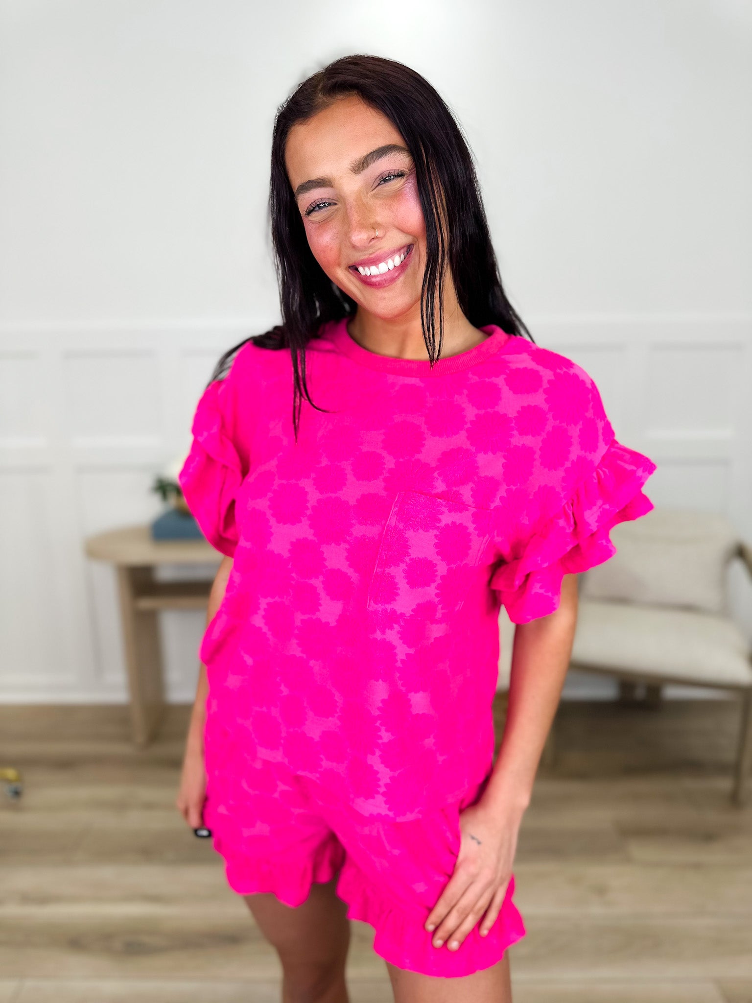 Kick off your season in style with this adorable high-rise shorts set! Featuring a cozy terry cloth fabric adorned with cheerful daisy prints, this two-piece combo pairs perfectly for effortless, feel-good vibes. The short-sleeve top keeps things breezy while the ruffled trim adds that extra touch of charm and personality. Whether you're lounging at home or stepping out for casual adventures, this set delivers comfort wrapped in playful style that makes getting dressed fun again.