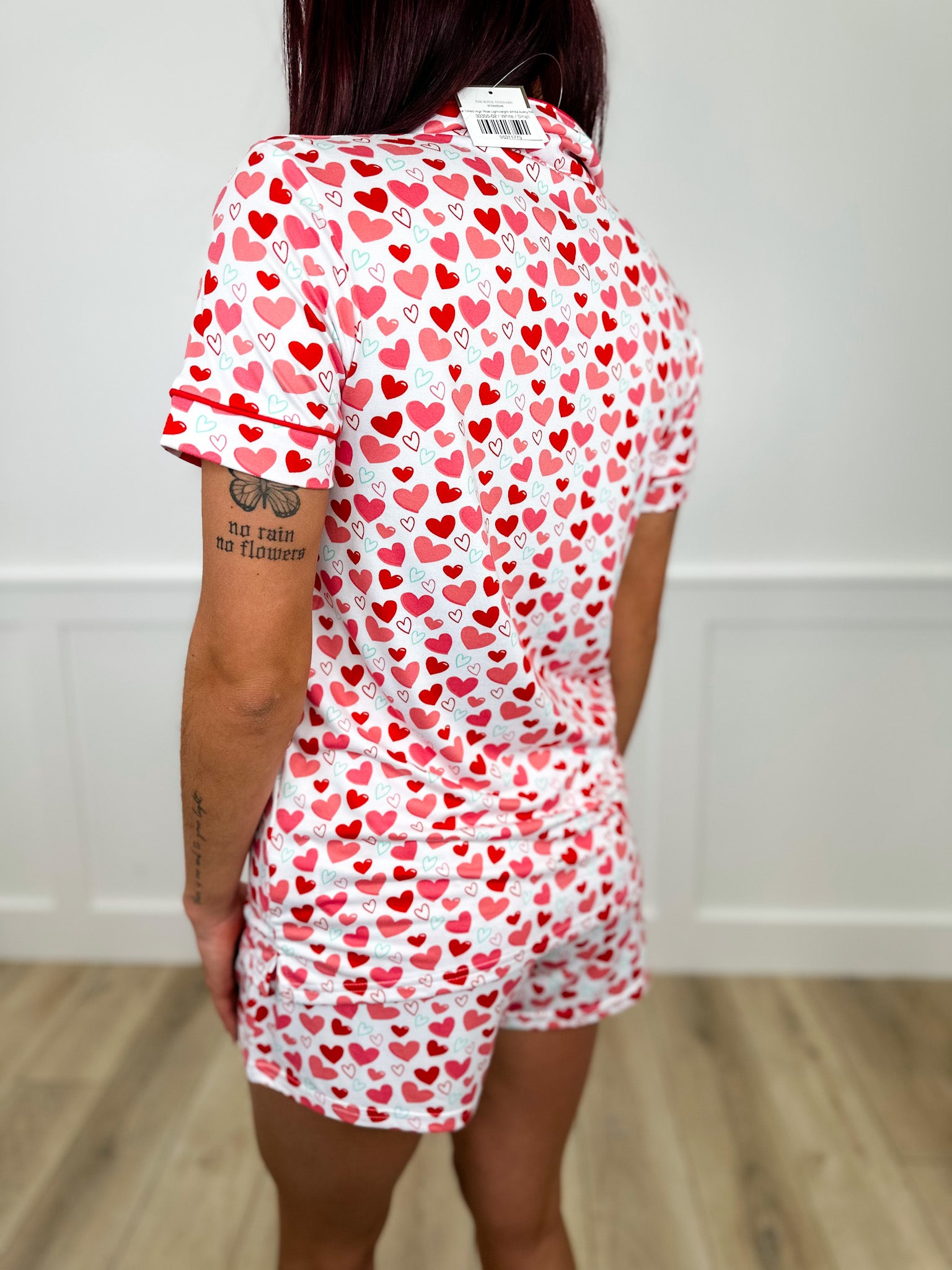 Snuggle up in style with this adorable Valentine's Day pajama set! Featuring a short sleeve button-up top paired with comfy elastic waistband shorts, both adorned with sweet heart details. Perfect for cozy nights in or gifting to your favorite person. Lightweight and breathable, this white set keeps you comfortable while spreading the love.