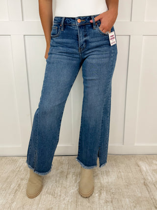 Risen Carrie Tummy Control Mid Rise Fray Hem Wide Leg Cropped Medium Wash Jeans