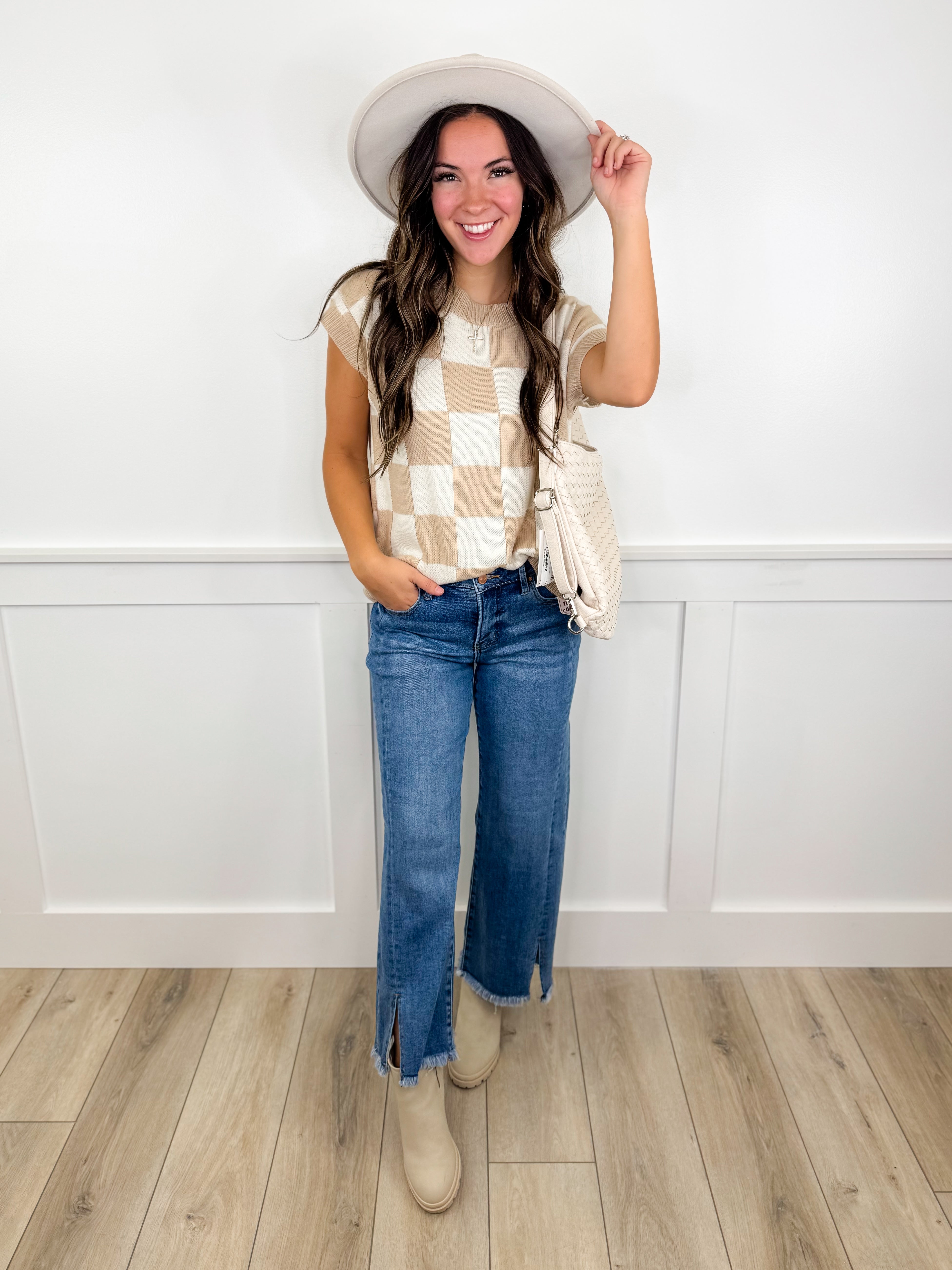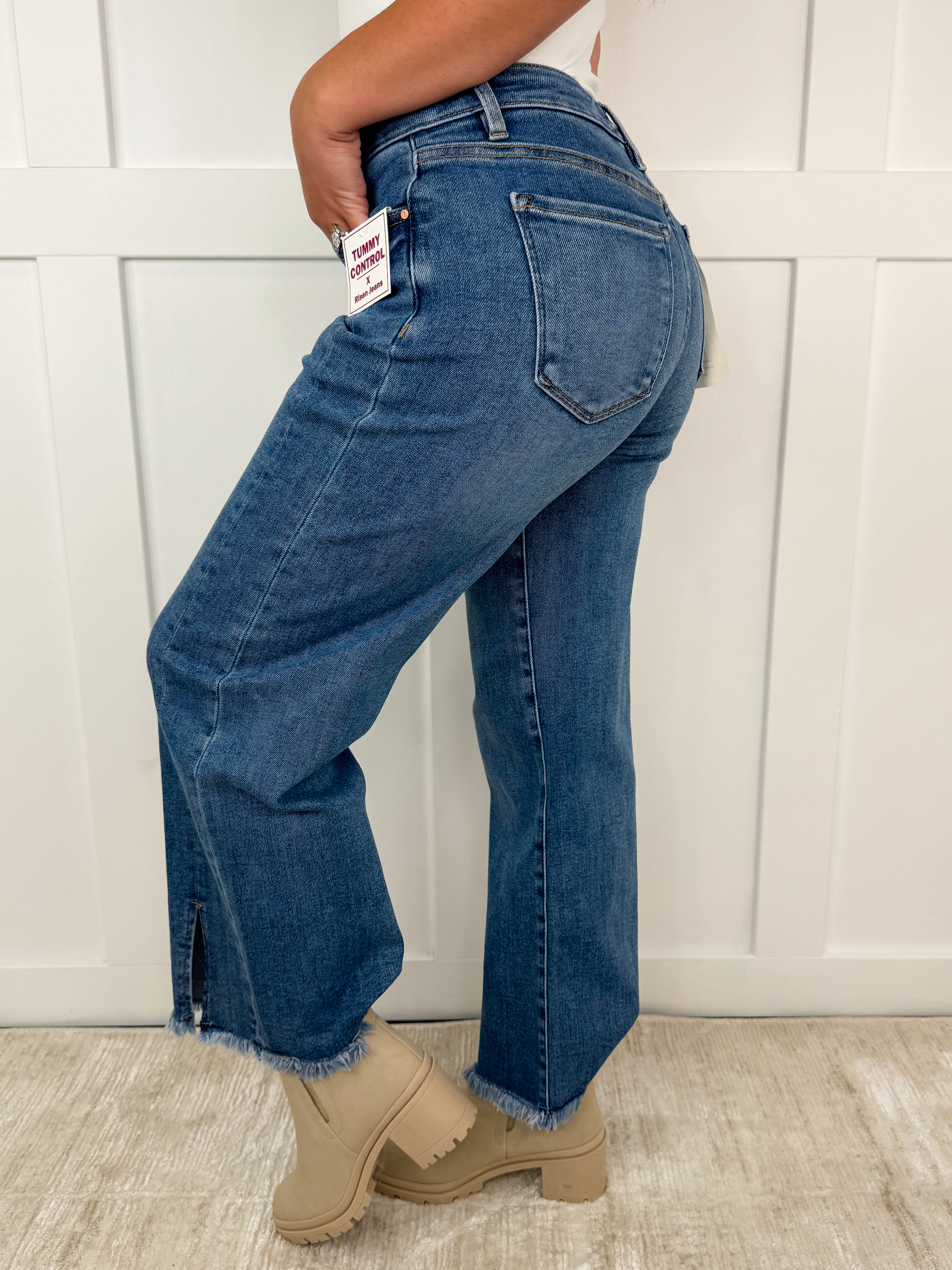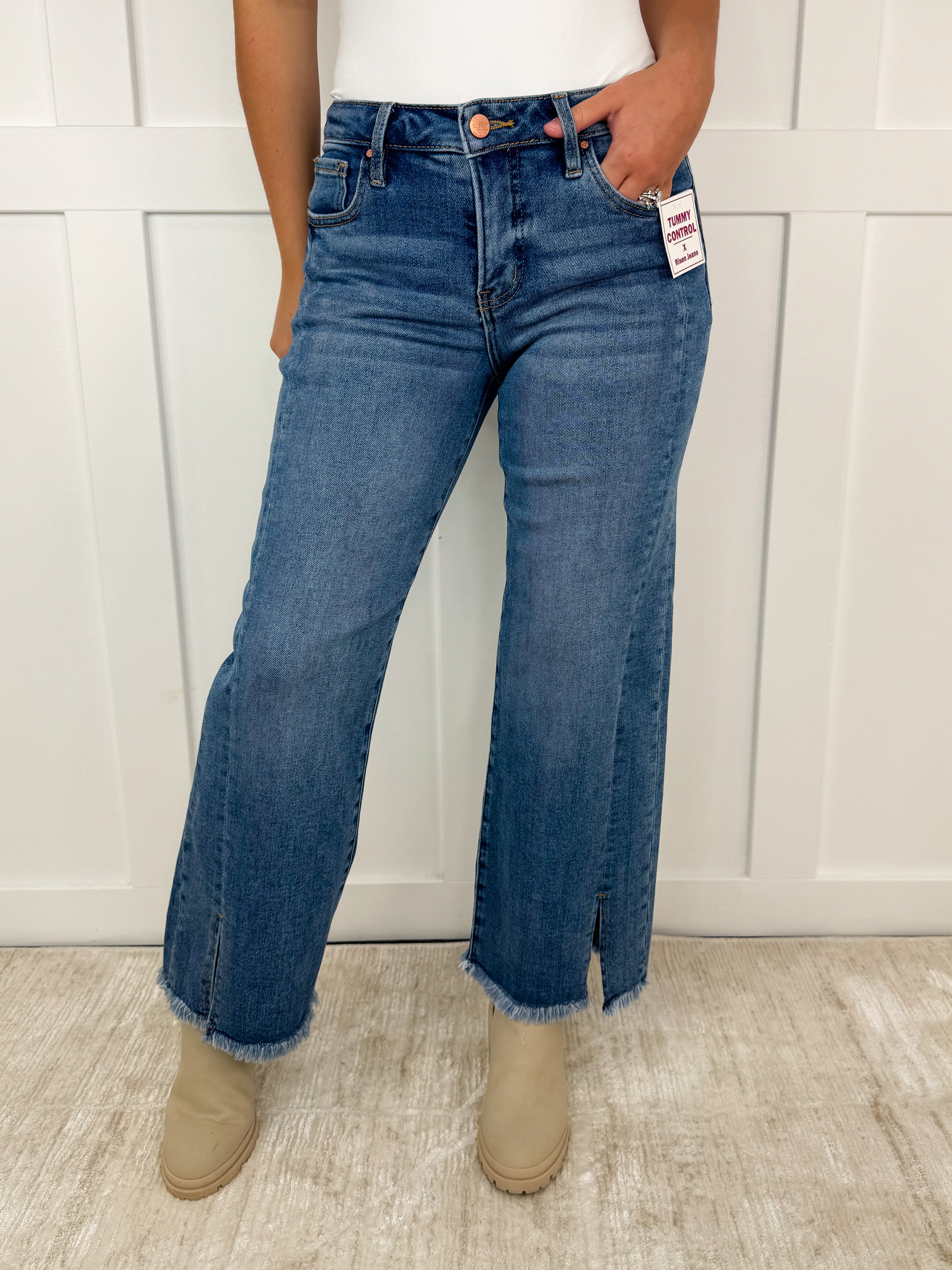These medium wash cropped jeans feature a mid-rise fit with tummy control for a flattering silhouette. The wide-leg design and front slits add a modern, elegant touch, while the fray hem completes the look with a subtle edge. Perfect for a refined yet relaxed style.
