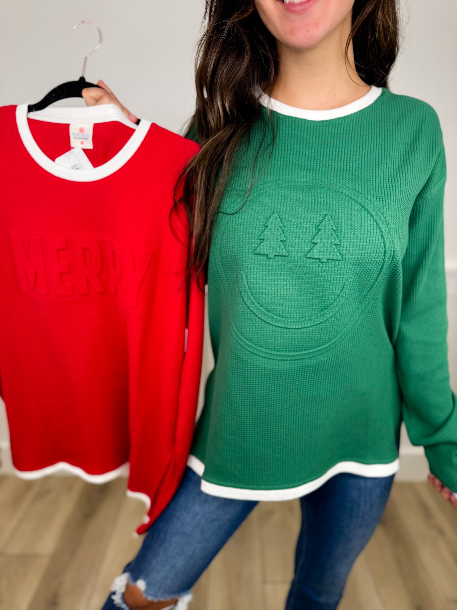 Celebrate cozy vibes with the Merry Holidays Cotton Blend Long Sleeve Avery Mae Top, available in two fun styles! Choose between a cheerful embossed smiley face with tree eyes or a festive "Merry" design. Both feature playful accent ribbing on the neckline, cuffs, and hem, a comfy waffle texture, and side slits for easy movement. This pullover top is perfect for adding a touch of holiday spirit to your everyday look.