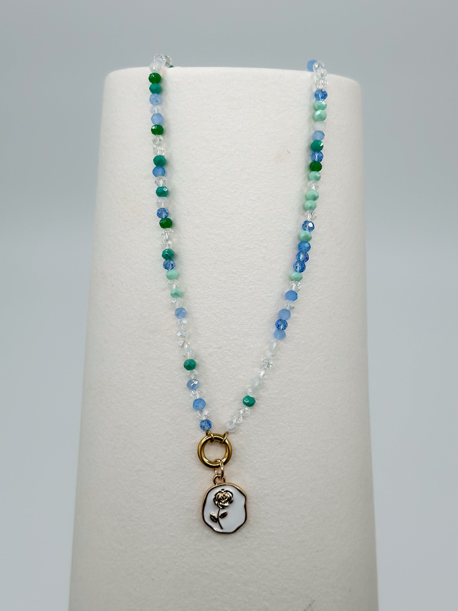 This charming beaded necklace brings a playful pop of color to any outfit. Strung with vibrant green and white beads accented with hints of blue, it features a delicate white floral pendant and shimmering gold details that catch the light beautifully. Perfect for adding a touch of whimsy to your everyday style or layering with other pieces for a fun, personalized look.