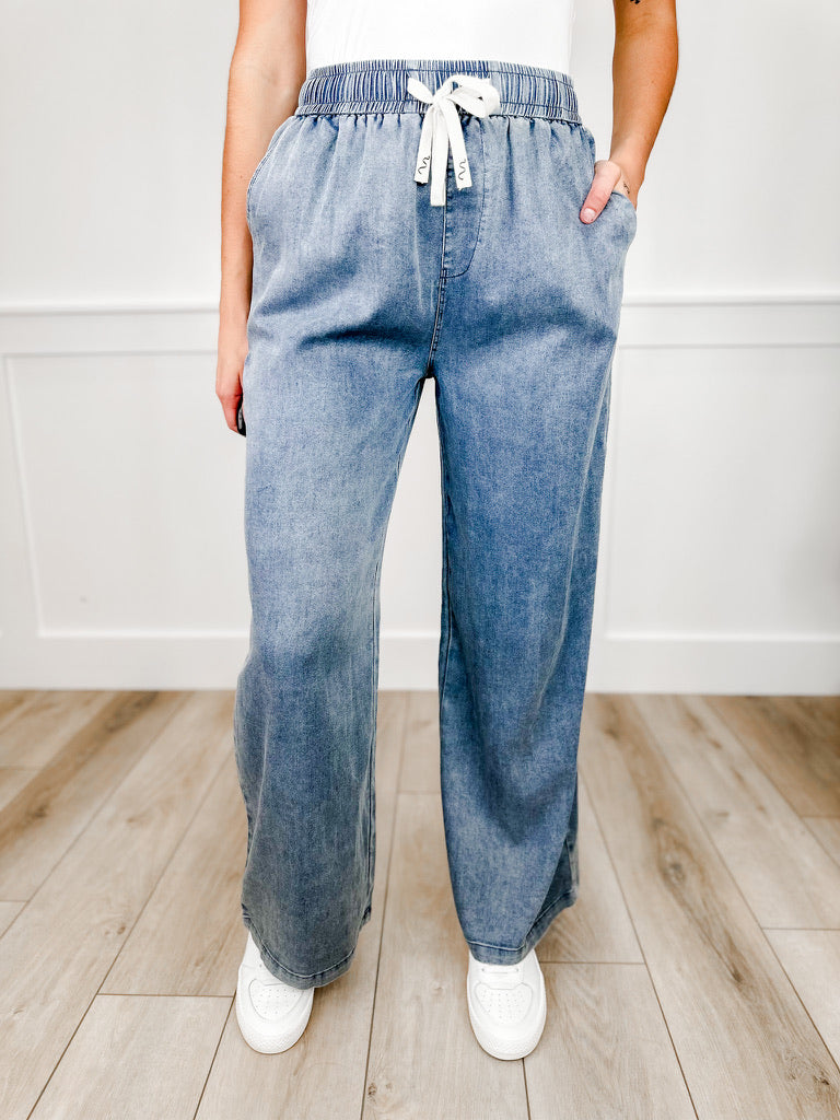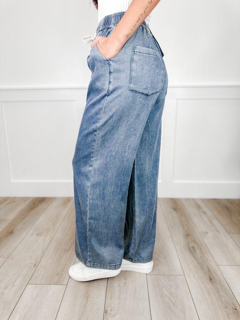 Meet your new favorite pair. These high-rise, wide-leg bottoms blend comfort with effortless style in a soft medium wash denim. The elastic waistband and flowy fit make them perfect for days when you want to feel as good as you look.