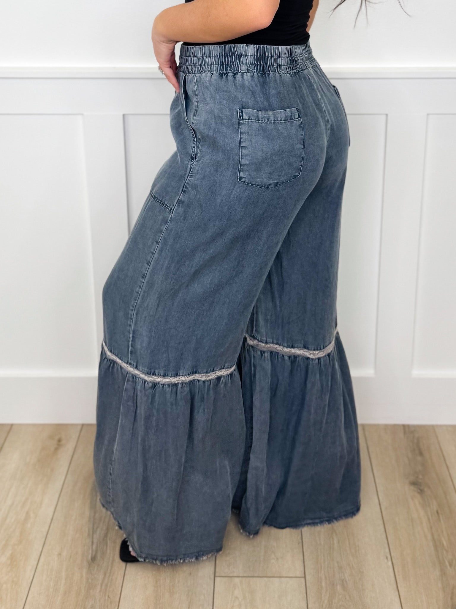 Embrace effortless style with these high-rise palazzo pants that feel as good as they look. The lightweight medium wash denim pairs perfectly with the playful lace detail just under the knee, adding a touch of romance to your everyday look. Adjust the drawstring waistband for your ideal fit, and slip your essentials into the functional pockets—because who doesn't love a pair of pants that actually has them? Perfect for those days when you want to feel put-together without trying too hard.