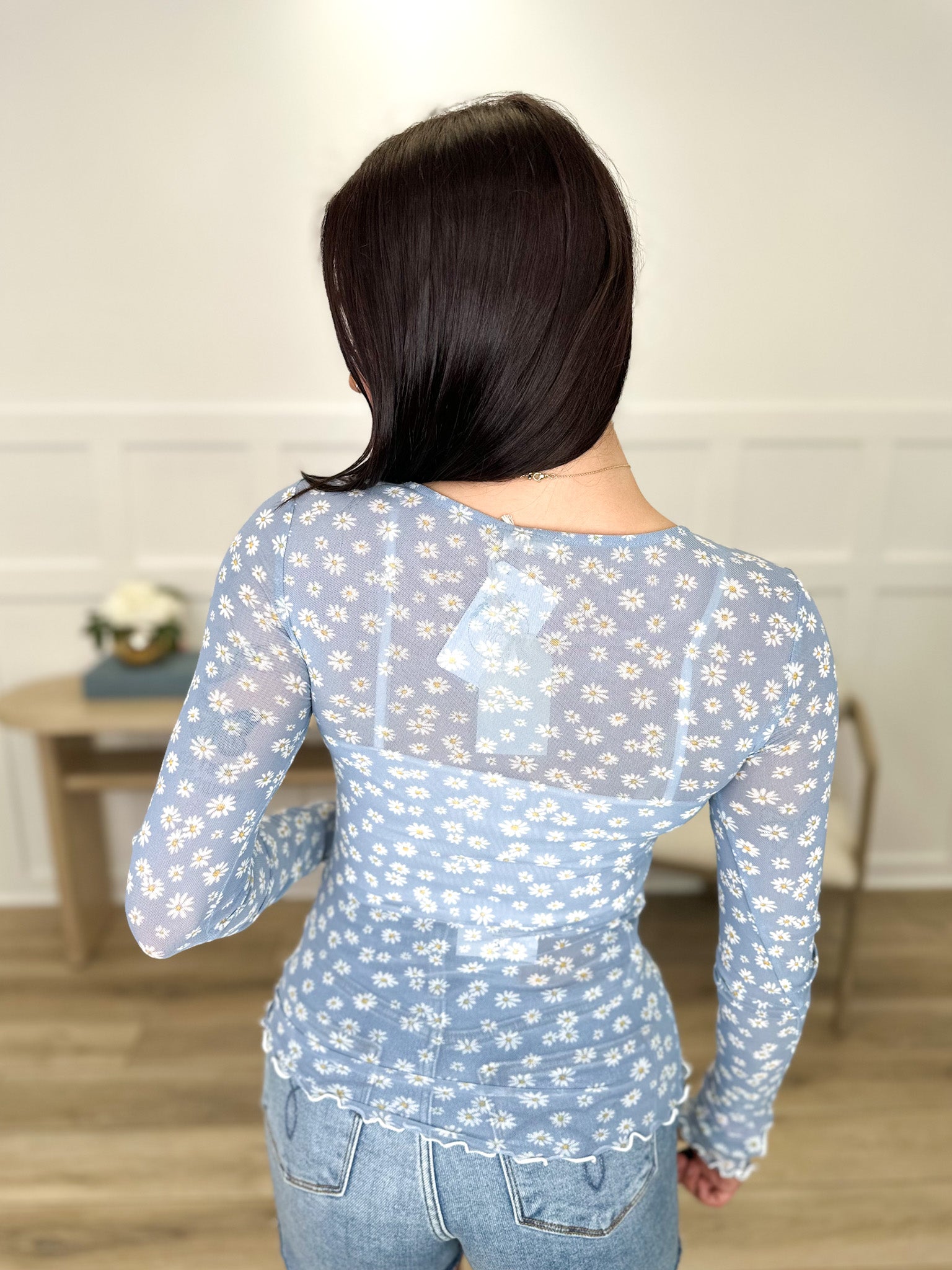 Discover understated elegance with this daisy print sheer mesh top, complete with practical thumb holes and a flattering scoop neckline. Long sleeves offer gentle coverage while the delicate lettuce hem adds a refined, finished touch to the cuffs and hemline. The breathable mesh fabric showcases a soft blue botanical pattern, making it perfect for layering or wearing alone. Ideal for transitional seasons, this versatile piece effortlessly transitions from casual days to relaxed evenings with timeless charm.