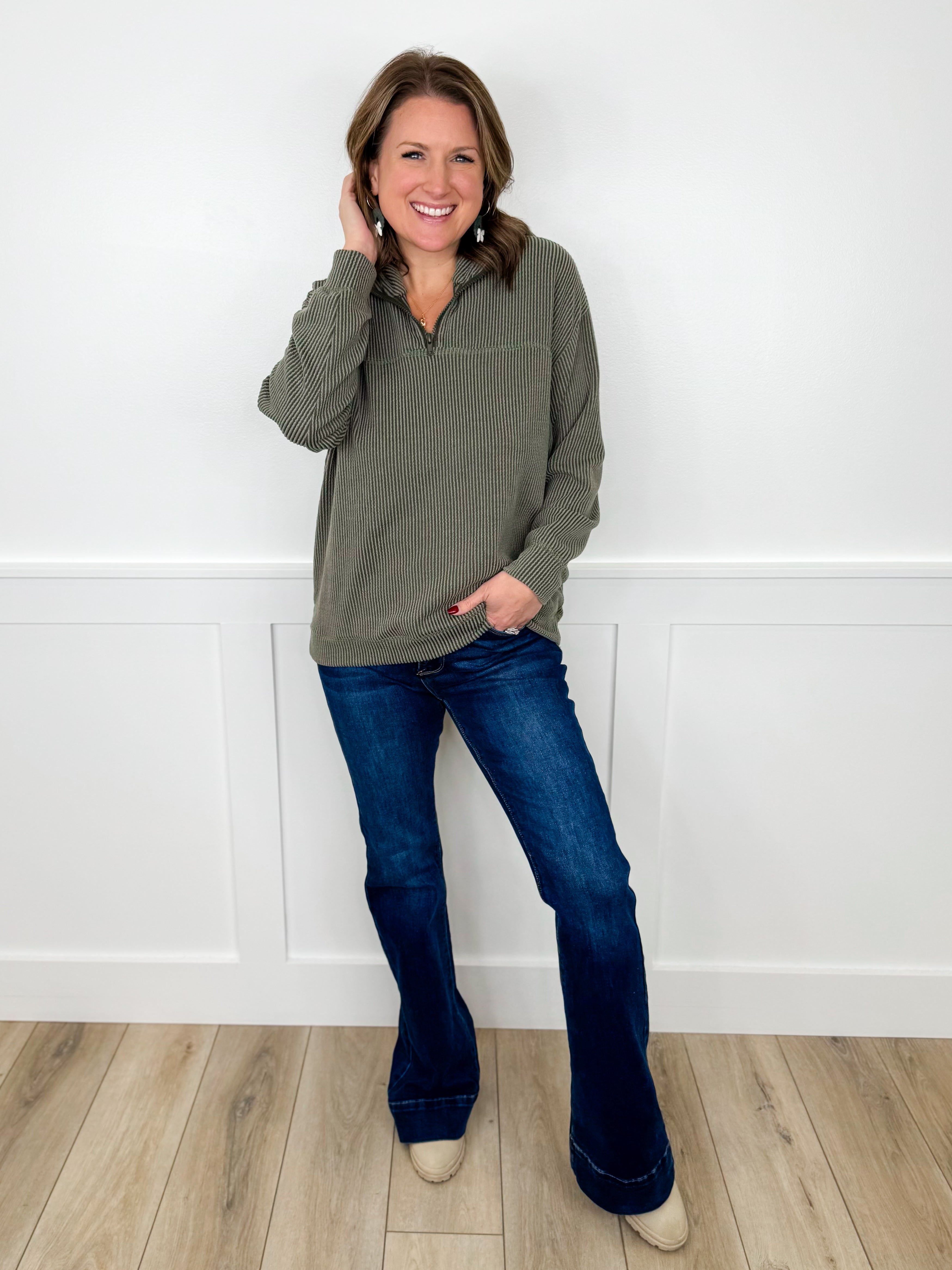 Layer up with the Quiet Confidence Ribbed Long Sleeve Quarter Zip Top—your new go-to for effortless style! This versatile piece features a classic ribbed texture and a convenient quarter zip for easy adjustability. Choose from three gorgeous colors to match your mood and wardrobe. Perfect for casual days, weekend adventures, or layering over your favorite tee. Comfort meets confidence in every wear.