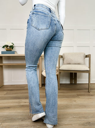 Saige Lacey Tummy Control Kick Flare Light Wash Jeans - Light Wash (Rhinestone, Raw Hem, Non-Distressed)
