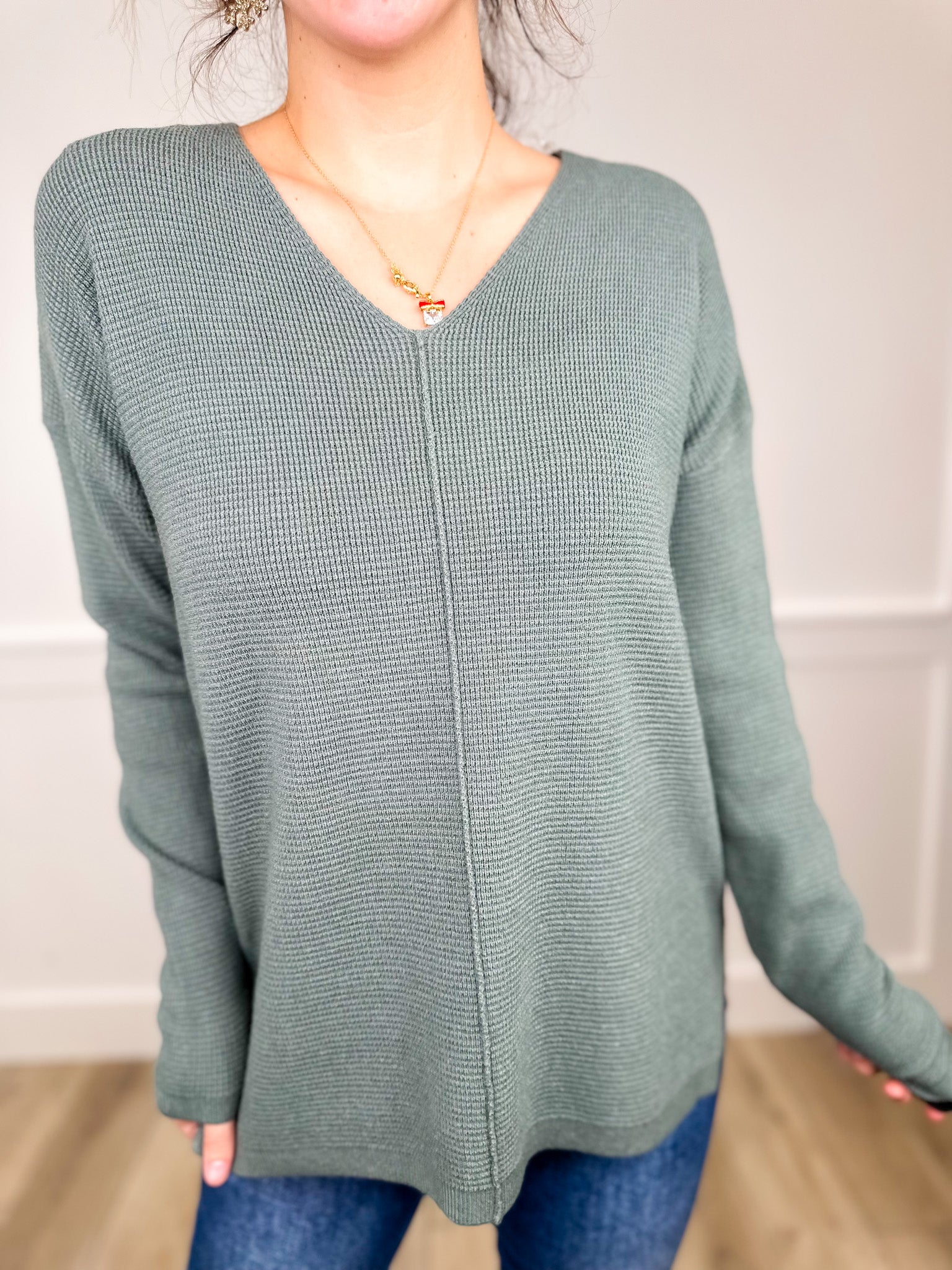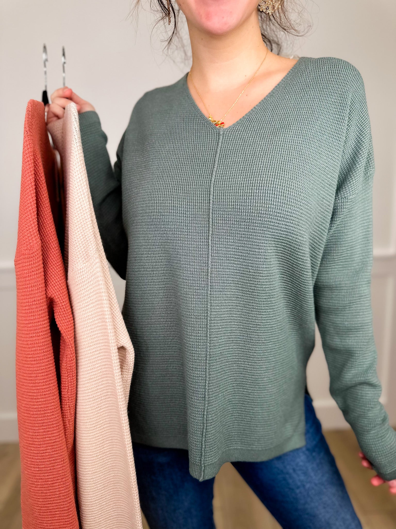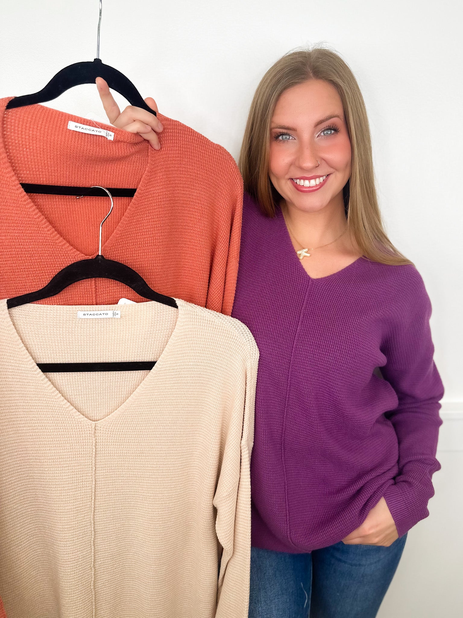 Cozy up in the All My Beauty Knit Long Sleeve Avery Mae Sweater Top, perfect for any day! This cute V-neck sweater comes in three fun colors, adding a playful pop to your wardrobe while keeping you comfy and stylish.