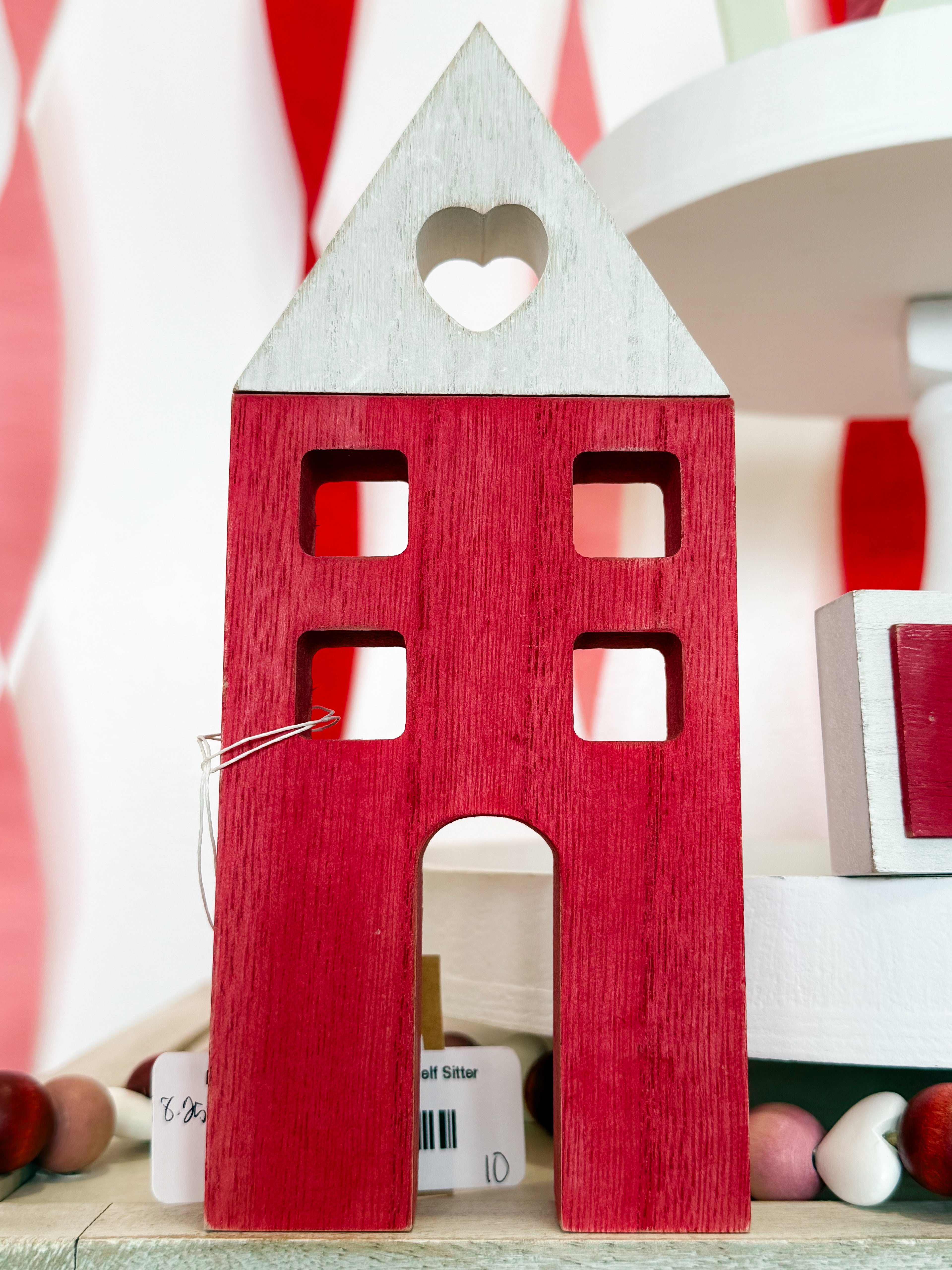 Celebrate love right where it matters most with this charming wood block shelf sitter. Featuring a sweet house cutout design in cheerful red and white, it's the perfect Valentine's Day accent for any room. Display it on shelves, mantels, or desks to spread cozy, heartfelt vibes. A delightful way to show that home is where the heart is—ideal for seasonal décor or year-round love-filled spaces.