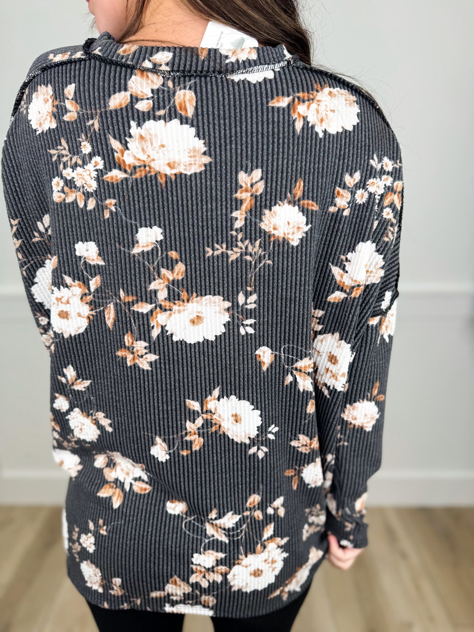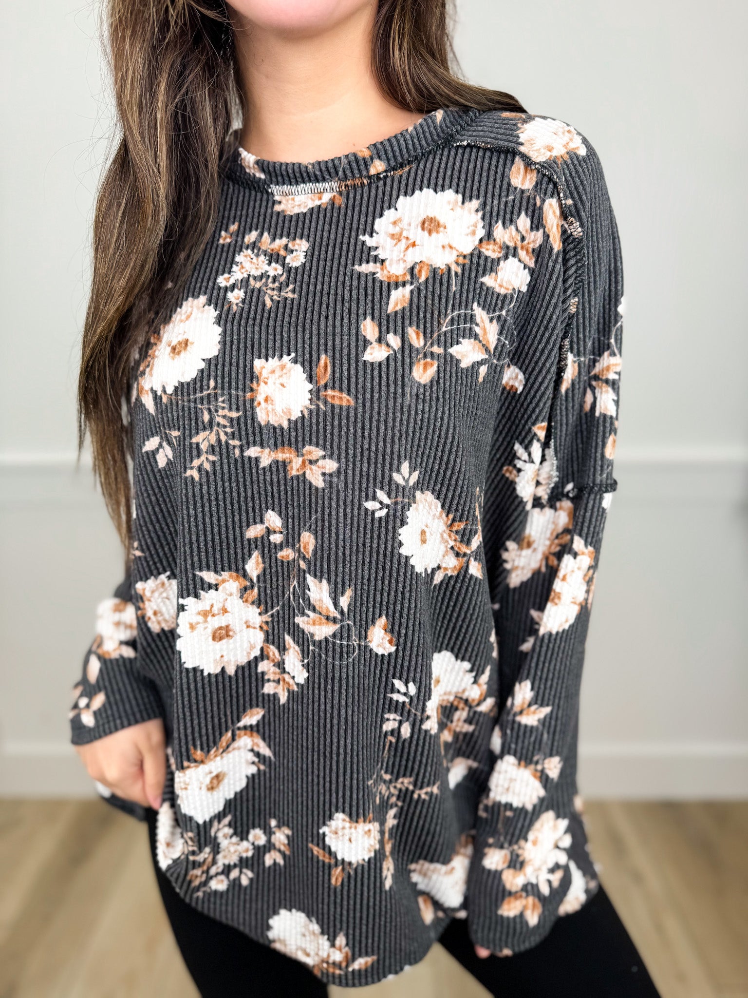 Embrace cozy charm with this Moonlit Bloom Ribbed Long Sleeve Tunic Top in charcoal. Soft, ribbed fabric hugs you just right, while the delicate ivory and cream floral accents add a touch of whimsy to your look. Perfect for layering or wearing solo, this playful tunic brings a fresh twist to your everyday wardrobe.