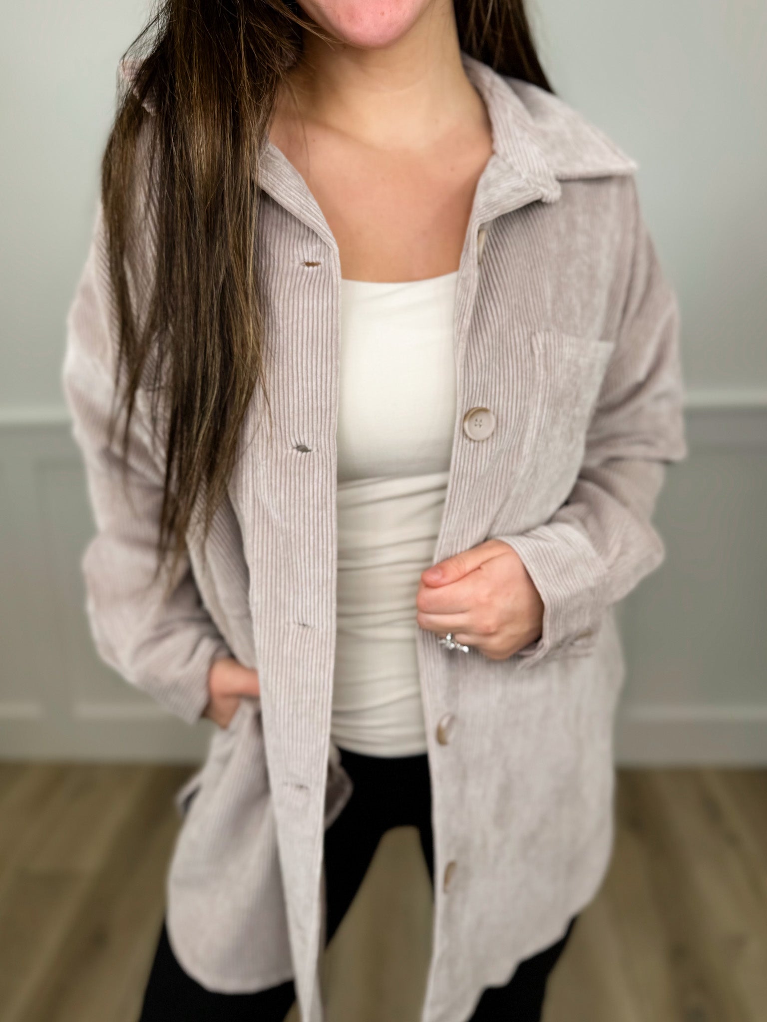 A Moment of Pause Corduroy Long Sleeve Taupe Avery Mae Shacket