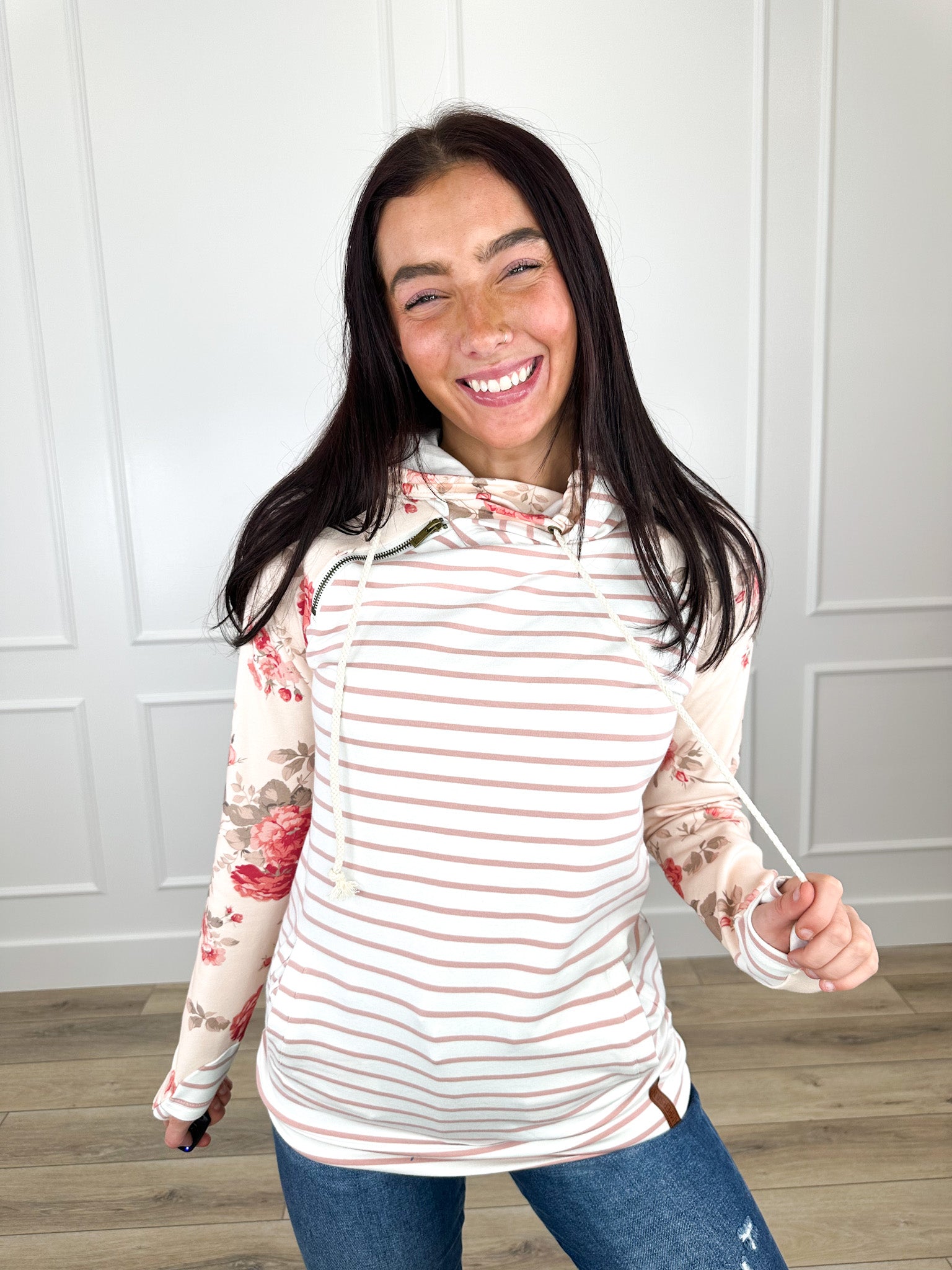 Engineered for comfort and styled for the bold, our Double-Layer Floral & Stripe Hoodie is a wardrobe powerhouse. Featuring a double hood and integrated thumbholes, this long-sleeve essential offers maximum coverage without sacrificing an ounce of style.