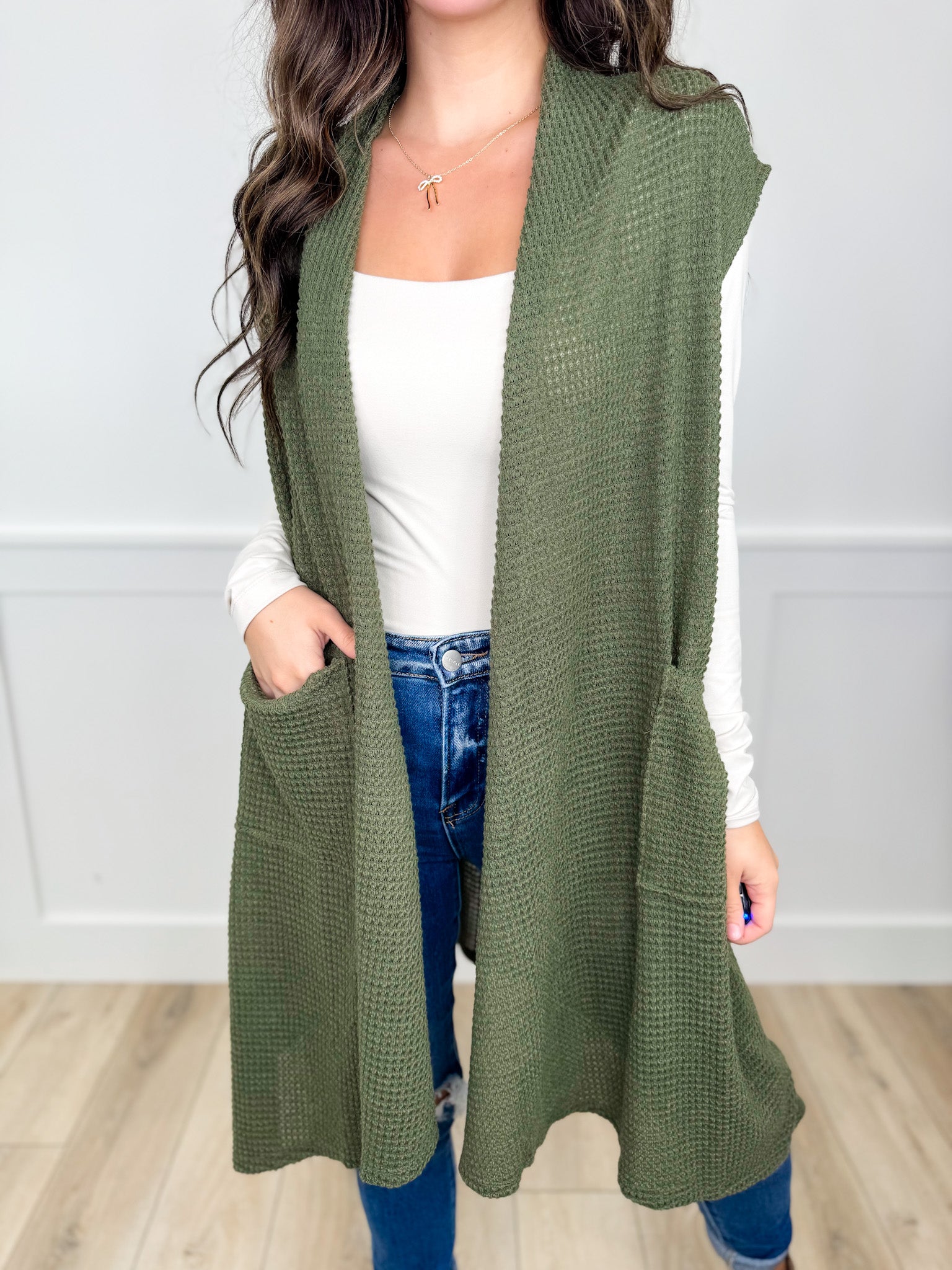 This sleeveless, long cardigan combines daring style with cozy comfort. Crafted from lightweight waffle knit fabric, it adds texture and warmth without the bulk. Featuring practical pockets, it’s perfect for layering boldly over any outfit to make a confident statement wherever you go.