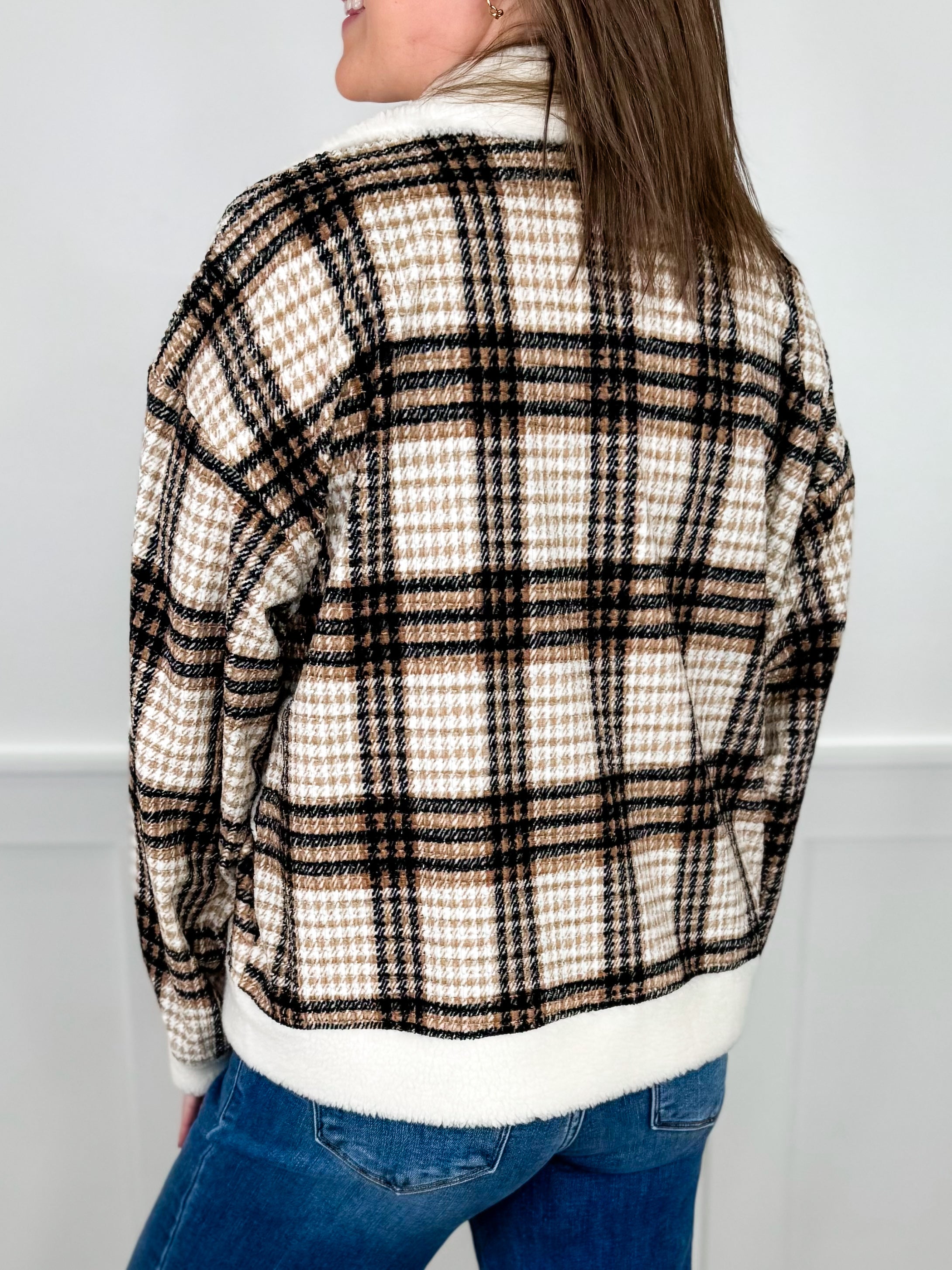 Layer up in style with our Elevated Level of Comfort Long Sleeve Ivory Avery Mae Shacket—the perfect piece that blurs the line between shirt and jacket. Featuring a timeless plaid pattern paired with cozy sherpa detailing, this versatile shacket keeps you warm without the bulk. Functional button closure and roomy pockets make it as practical as it is chic. Throw it over your favorite tee, dress it up with a blouse, or wear it solo—this wardrobe essential adapts to your vibe and keeps comfort at the forefront.