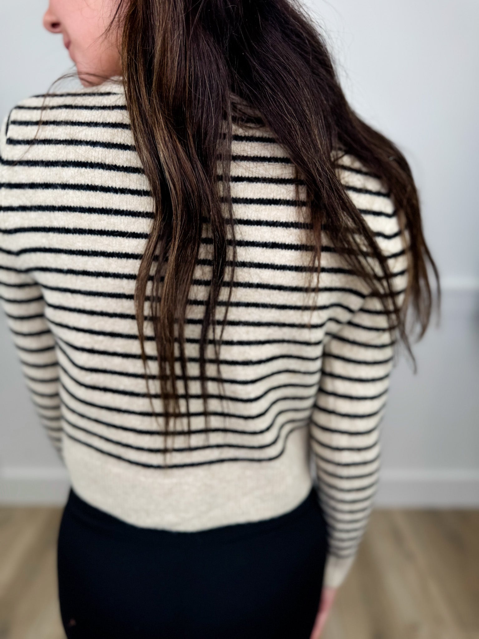 Cozy up in this playful sand-colored cardigan featuring chic black stripes for a stylish twist. The long sleeves make it perfect for layering, while the shiny gold buttons add a touch of fun and flair. Whether you’re dressing up or keeping it casual, this button-up knit is your new go-to for everyday comfort and charm.