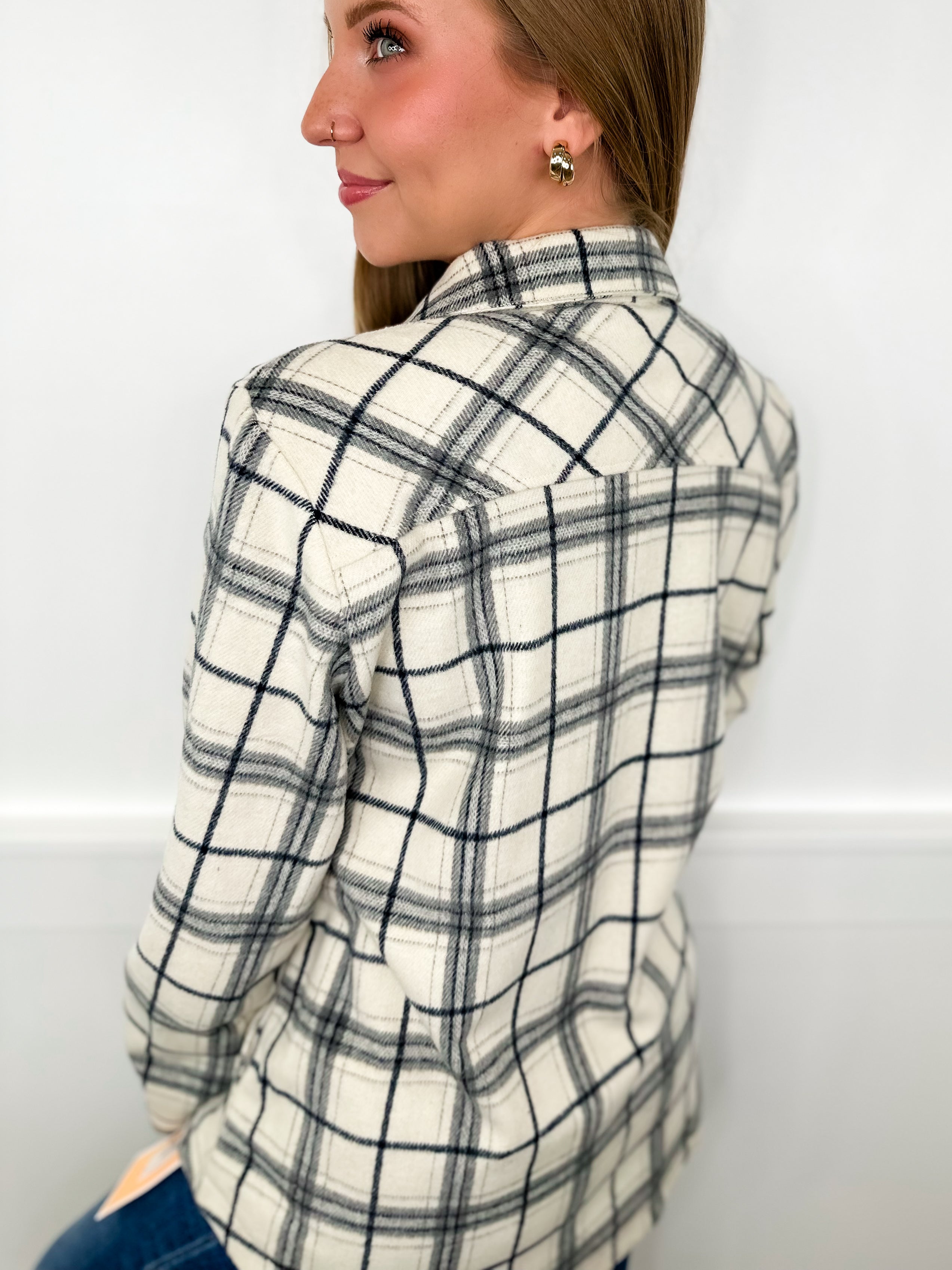 Stay warm and stylish with the Finding the Way Fleece Long Sleeve Cream Avery Mae Shacket, perfect for those chilly fall days. This playful plaid shacket features a functional side button and strap, letting you roll up the sleeves to a trendy 3/4 length. It’s the cozy, versatile layer you didn’t know you needed this season!