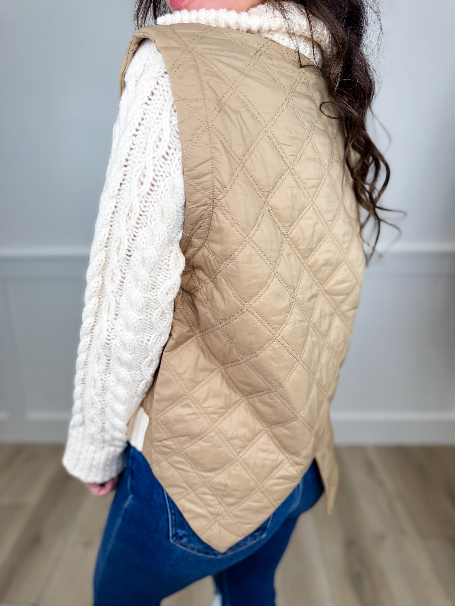 Fit | Feel | Stretch: True to Size | Quilted & Cable Knit | Very Stretchy | Functional Pockets.