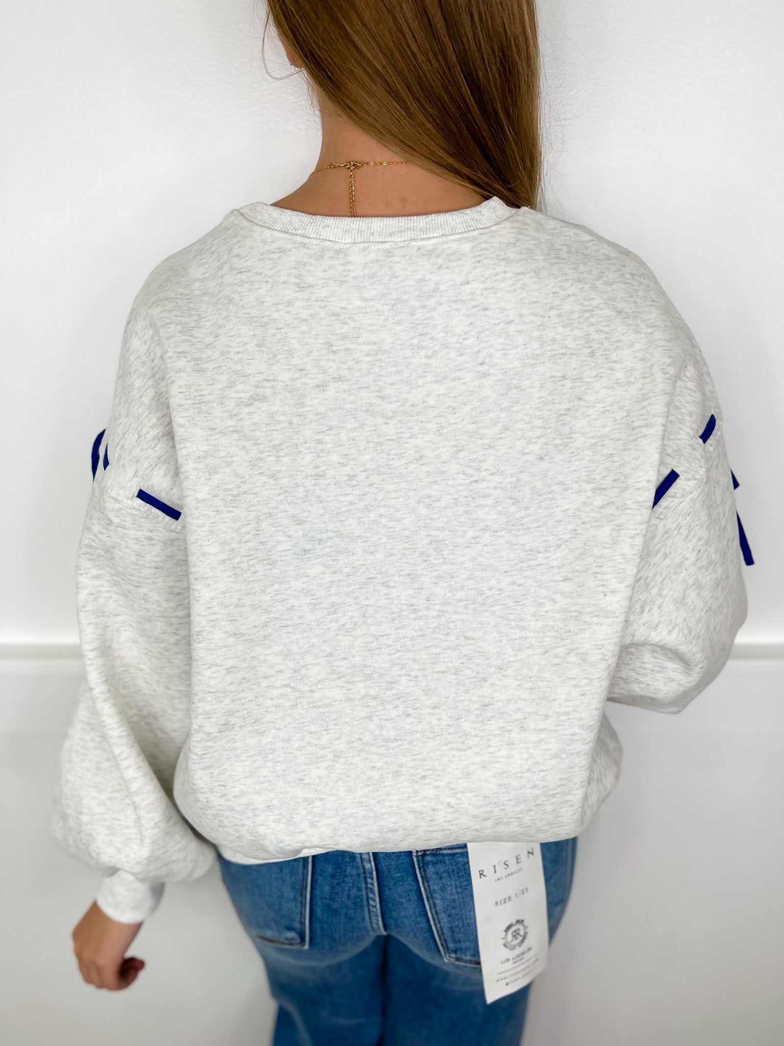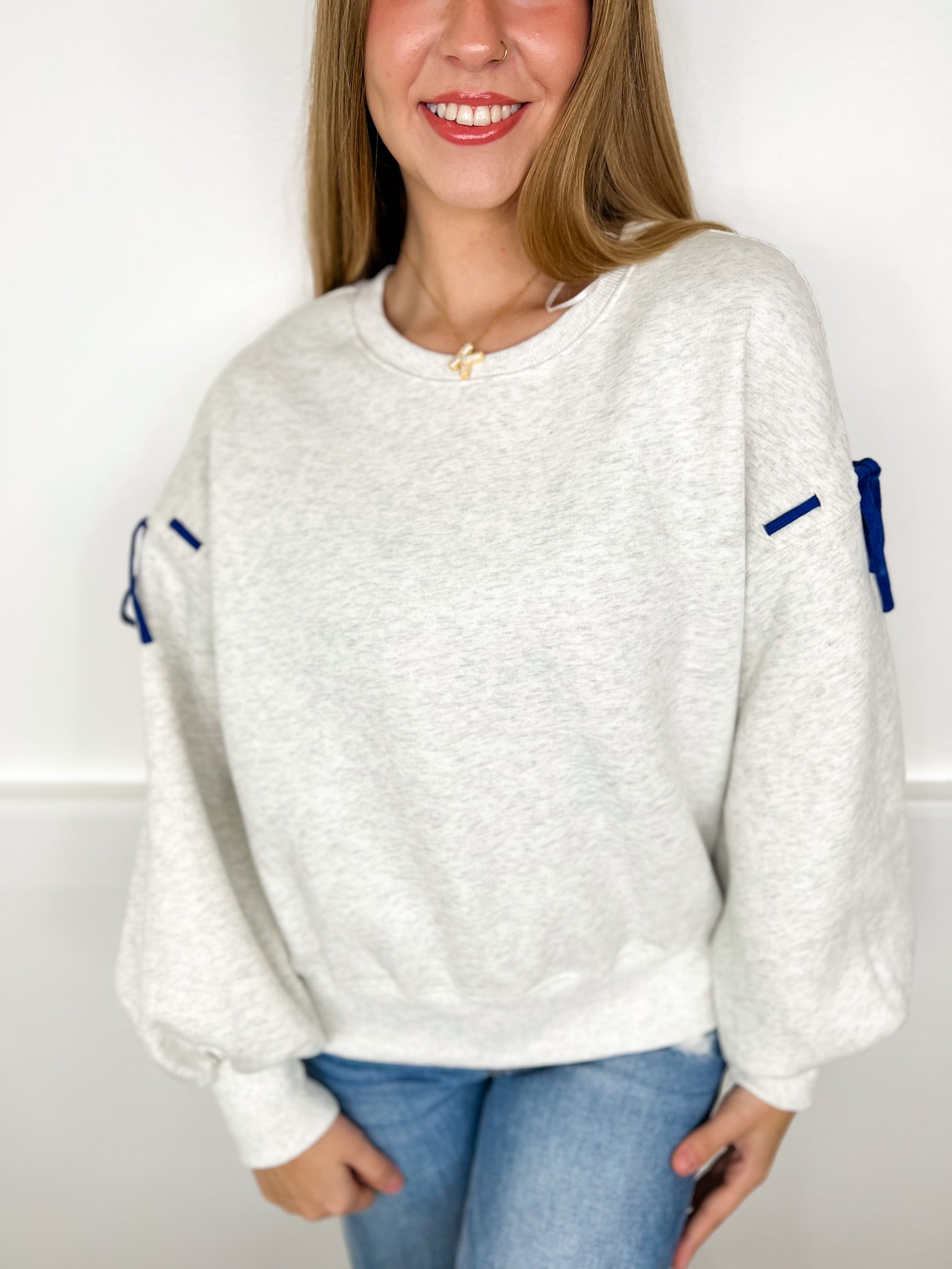Add a pop of unexpected fun with this grey long-sleeve sweatshirt featuring playful blue tie details on the shoulders. Perfect for layering, it keeps you cozy while letting your unique style shine through every casual moment.