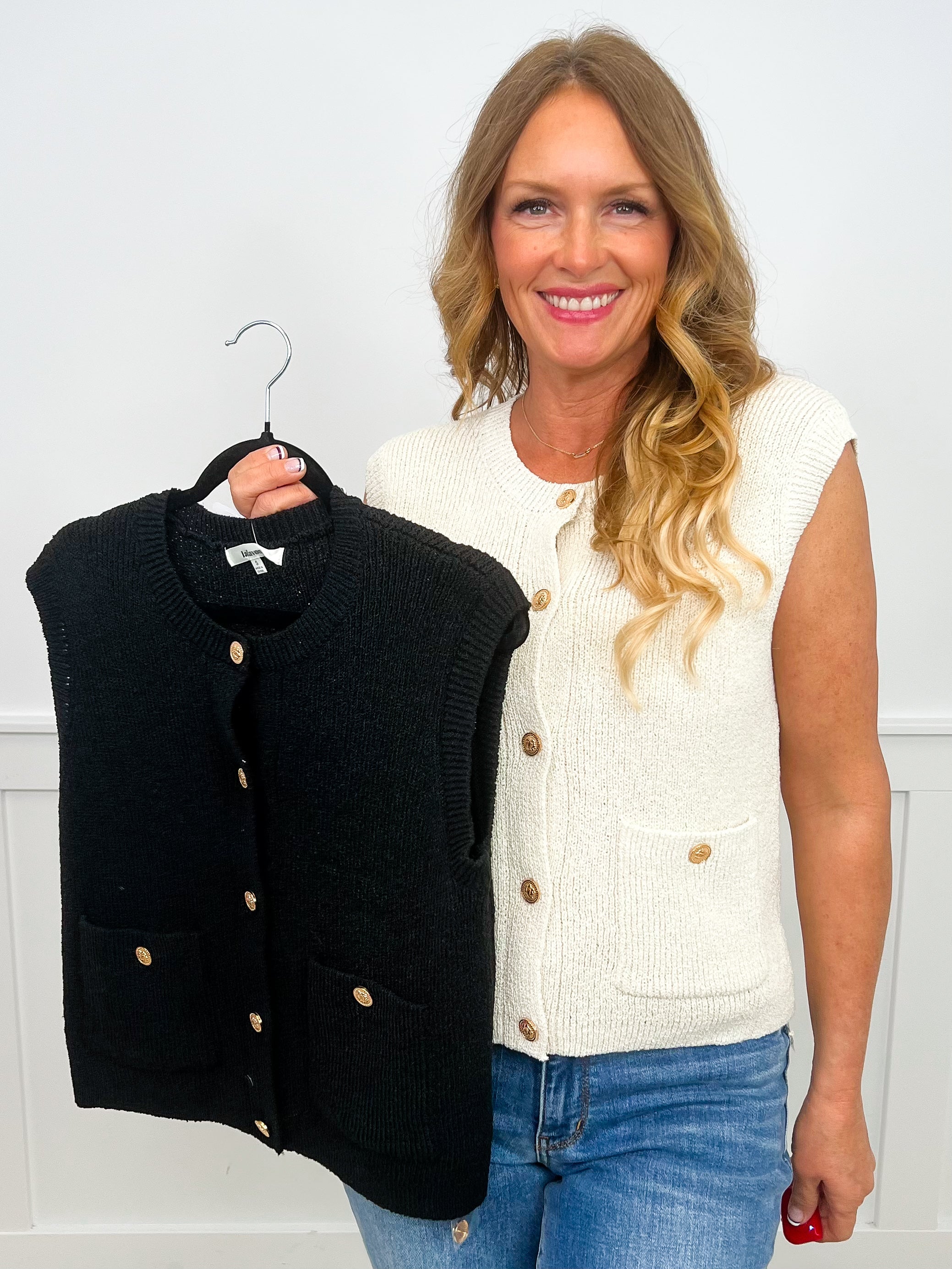 Unleash your style with the No Holding Back Knit Avery Mae Button Up Sweater Vest. Made of soft knit fabric, this vest features shining gold buttons and can be worn alone or as a stylish layering piece. Elevate your look with this versatile and chic sweater vest!