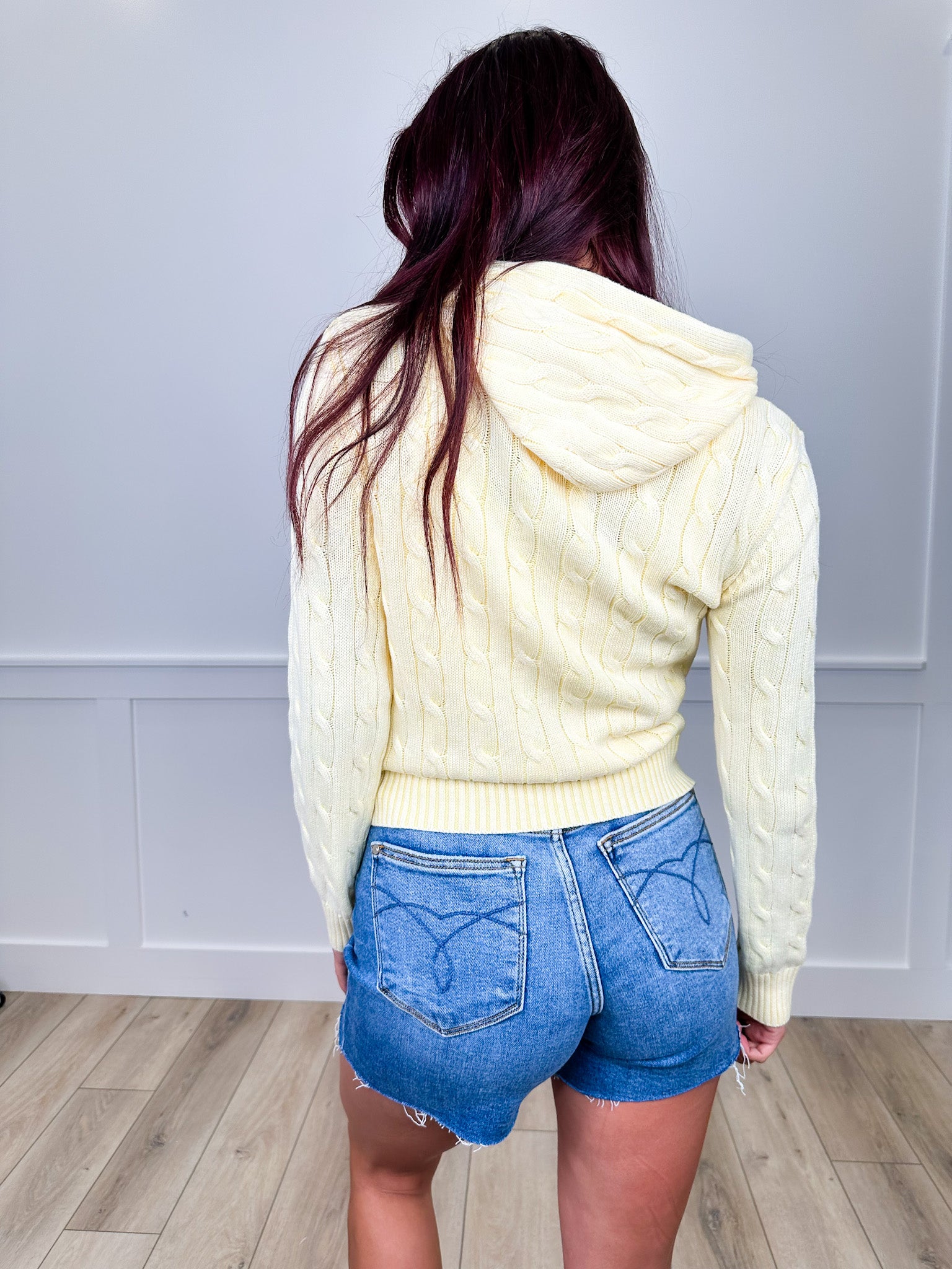 Zip up and hit the road in this cheerful yellow hooded sweater! Crafted from cozy cable knit fabric, it's perfect for layering on chilly adventures. The playful floral and lace-trimmed drawstrings add a sweet feminine touch that sets it apart from basic hoodies. Long sleeves keep you warm while the full zip design makes it easy to slip on and off. Whether you're road tripping or just running errands, this knit top brings comfort and style to your everyday rotation.