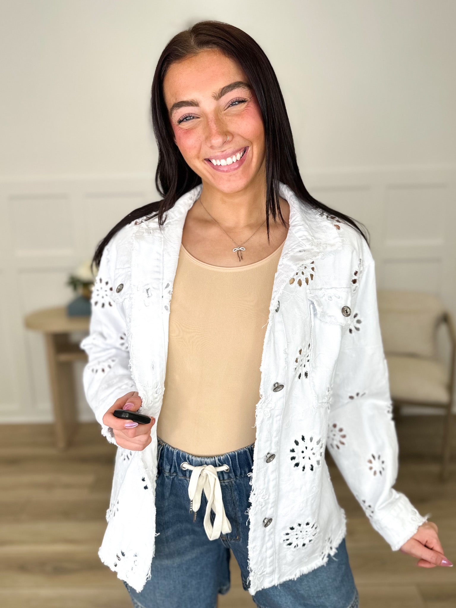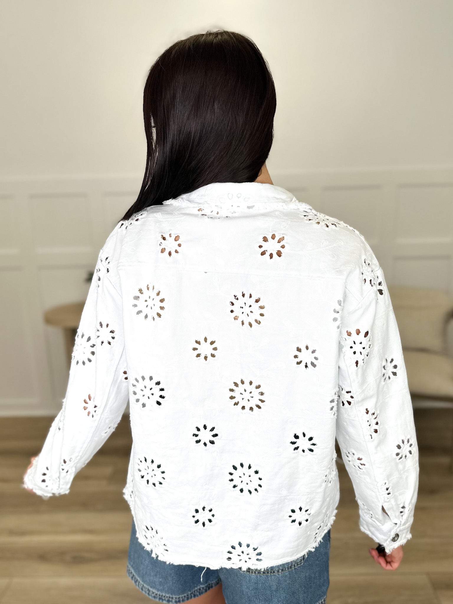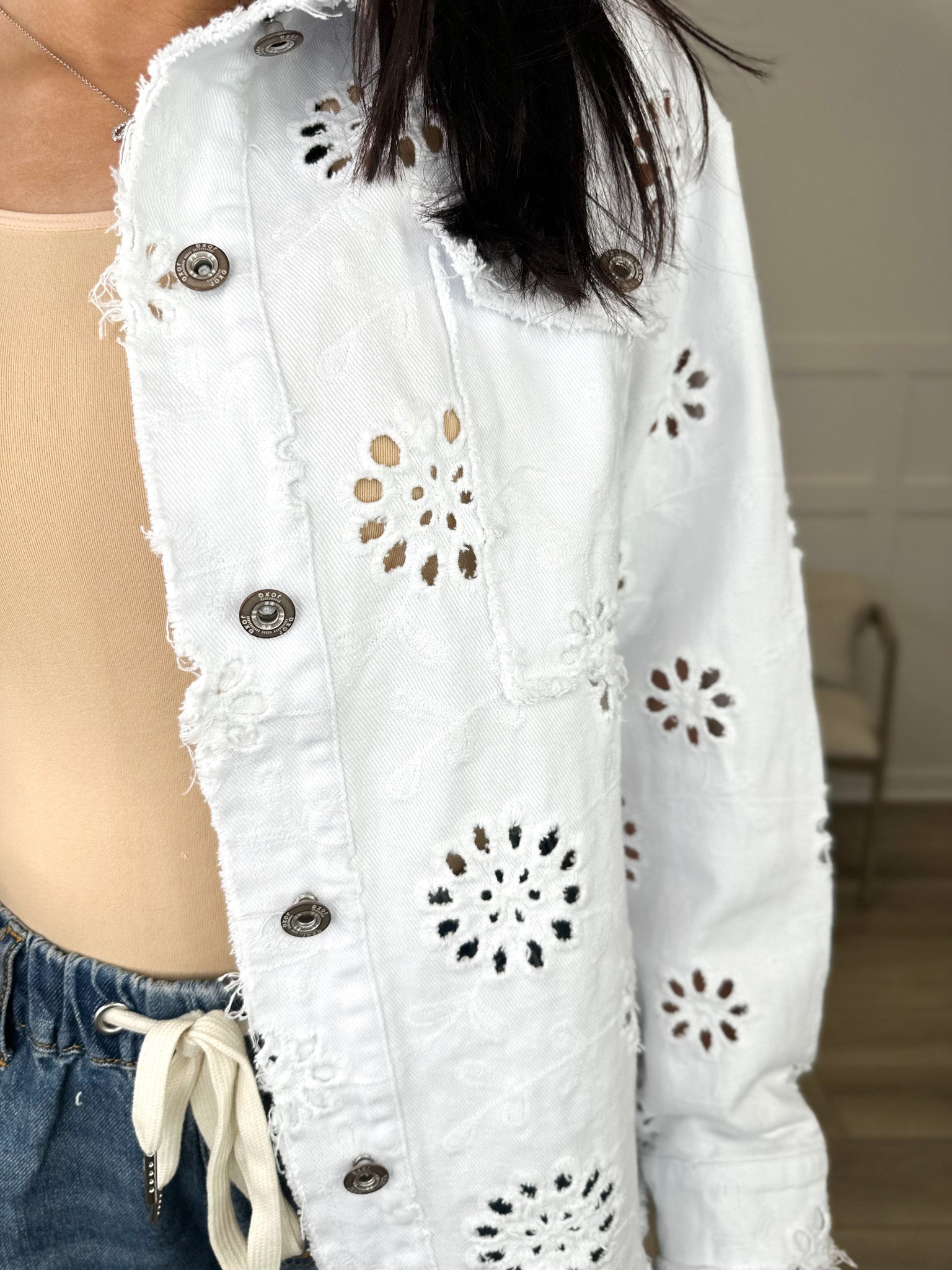 Elevate your layering game with a fresh take on a closet staple. This pristine white denim jacket swaps traditional ruggedness for refined artistry, featuring intricate all-over eyelet embroidery. The delicate floral cutouts provide a breezy, lightweight feel, making it the ideal companion for sundresses and garden parties.