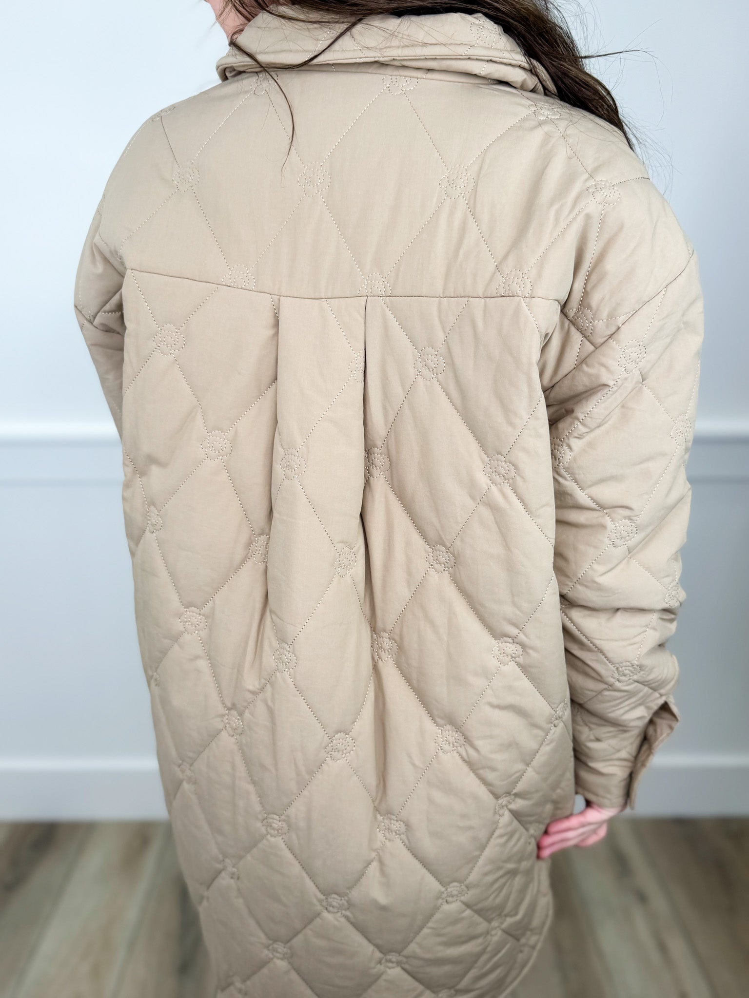 Stay cozy and stylish in the Sew In Love Just Blooming Long Sleeve Tan Jacket. This playful long jacket features split sides for easy movement and a button-up front for a classic touch. Functional pockets add practicality, while the quilted design sprinkled with delicate stitched flowers brings a charming, whimsical vibe to your everyday look. Perfect for layering and blooming with personality wherever you go!