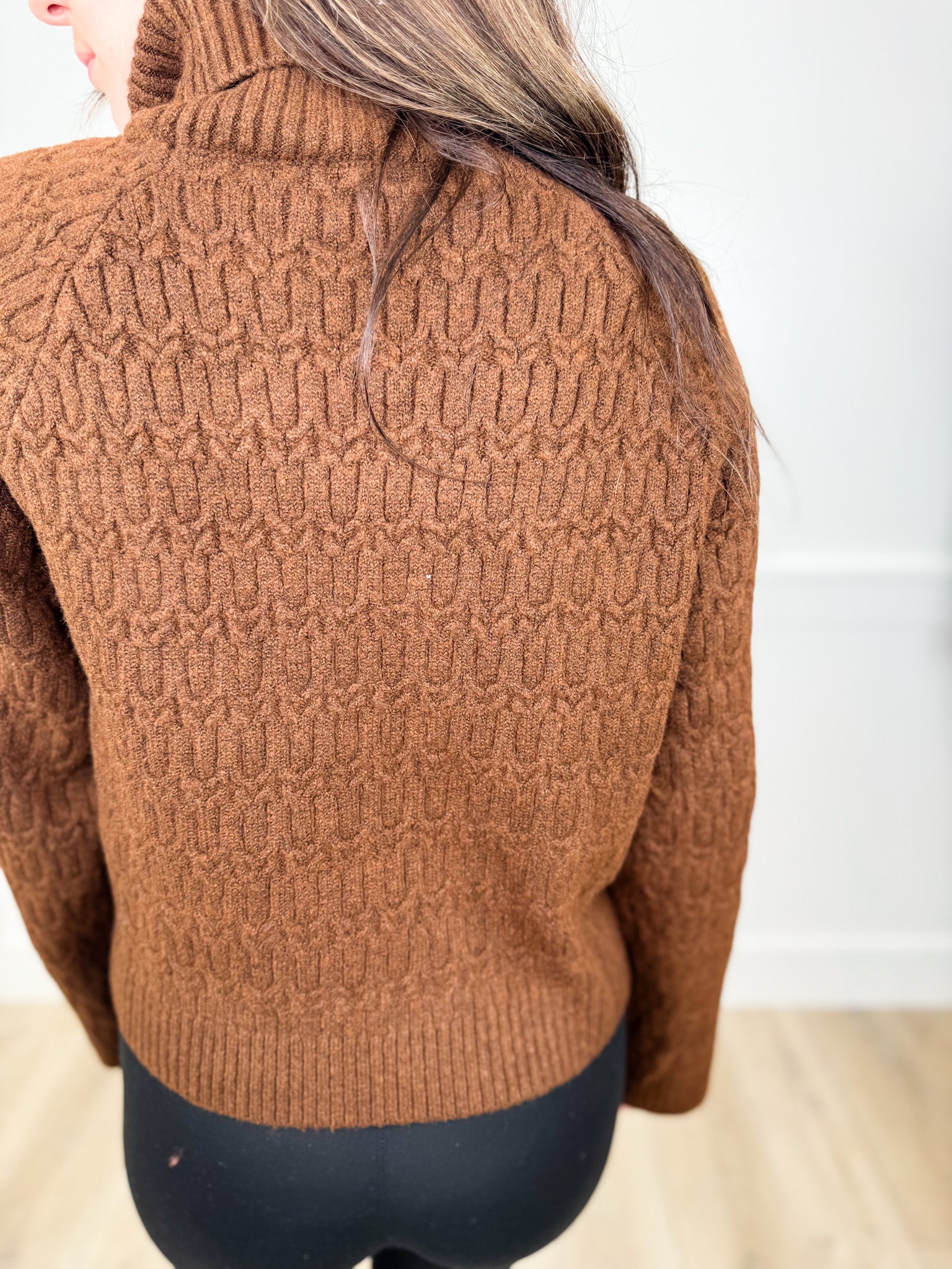 Cozy up in this White Birch Chilly Days Knit Sweater featuring a charming brown turtle neck and textured knit design. Its long sleeves and snug fit make it perfect for chilly days, keeping you warm while adding a playful touch to your fall wardrobe. Perfect for layering or wearing solo, this sweater blends comfort with style effortlessly.