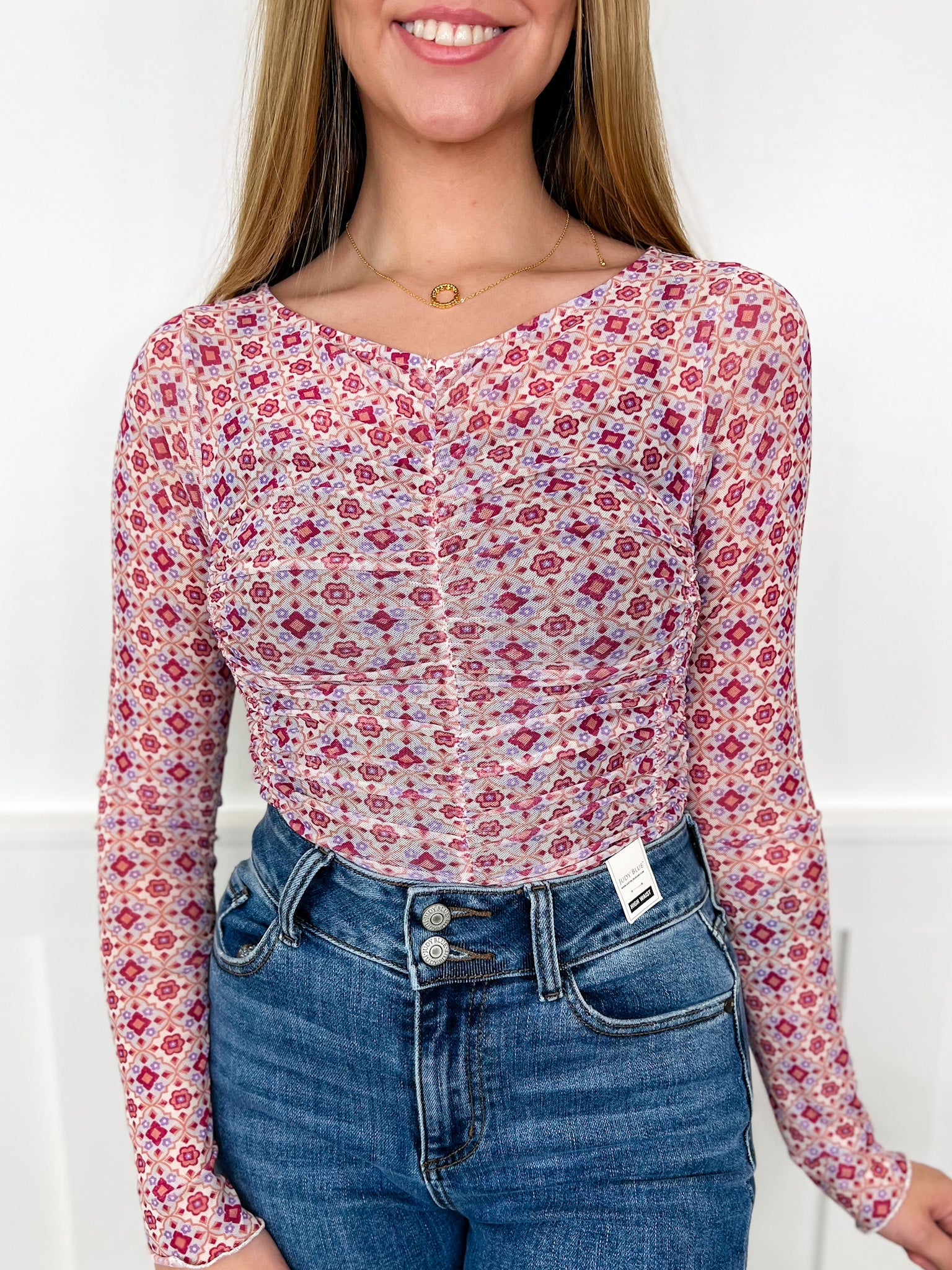 The Bloom Through It top combines a playful, floral geometric pattern with a delicate sheer ivory mesh for a light, feminine look. Its long sleeves and charming lettuce hem add flirty movement and subtle texture, making this piece perfect for layering or standing out on its own with a touch of whimsical elegance.