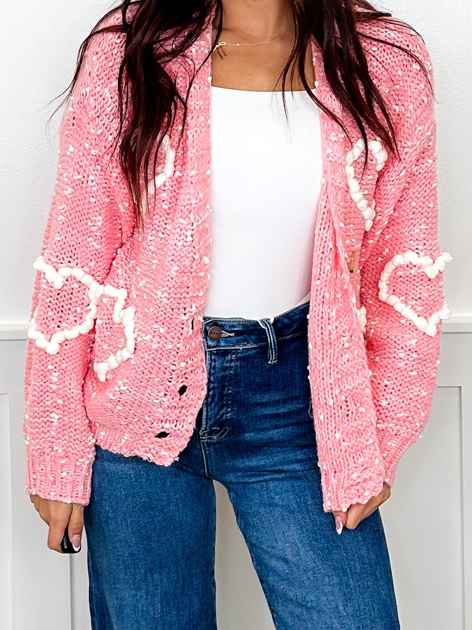 Fall in love with our Falling in Love Knit Long Sleeve Pink Avery Mae Cardigan! Perfect for Valentine's Day, this chunky knit cardigan features heart designs and a popcorn knit for added contrast. Stay cozy and stylish in this must-have piece.