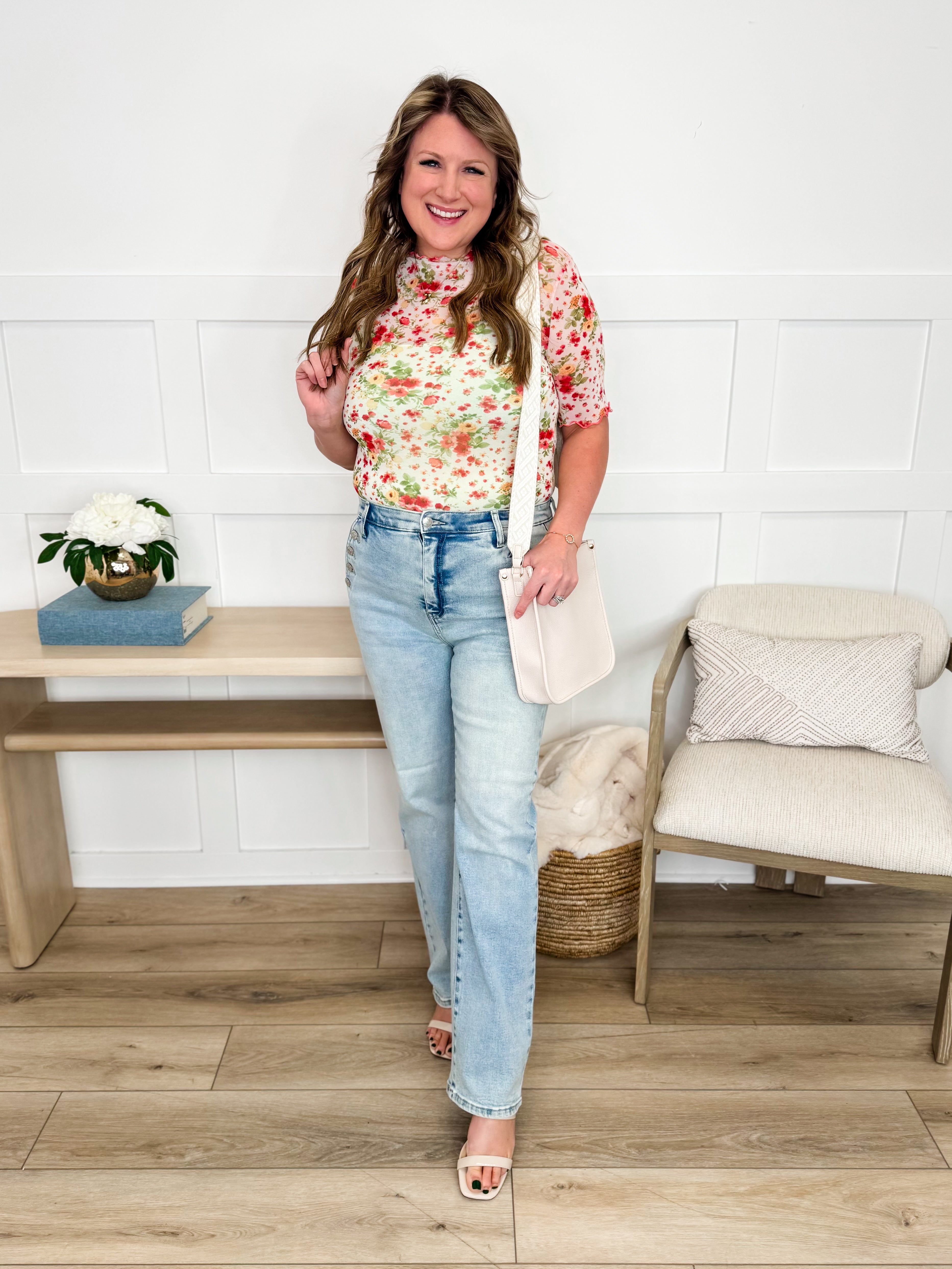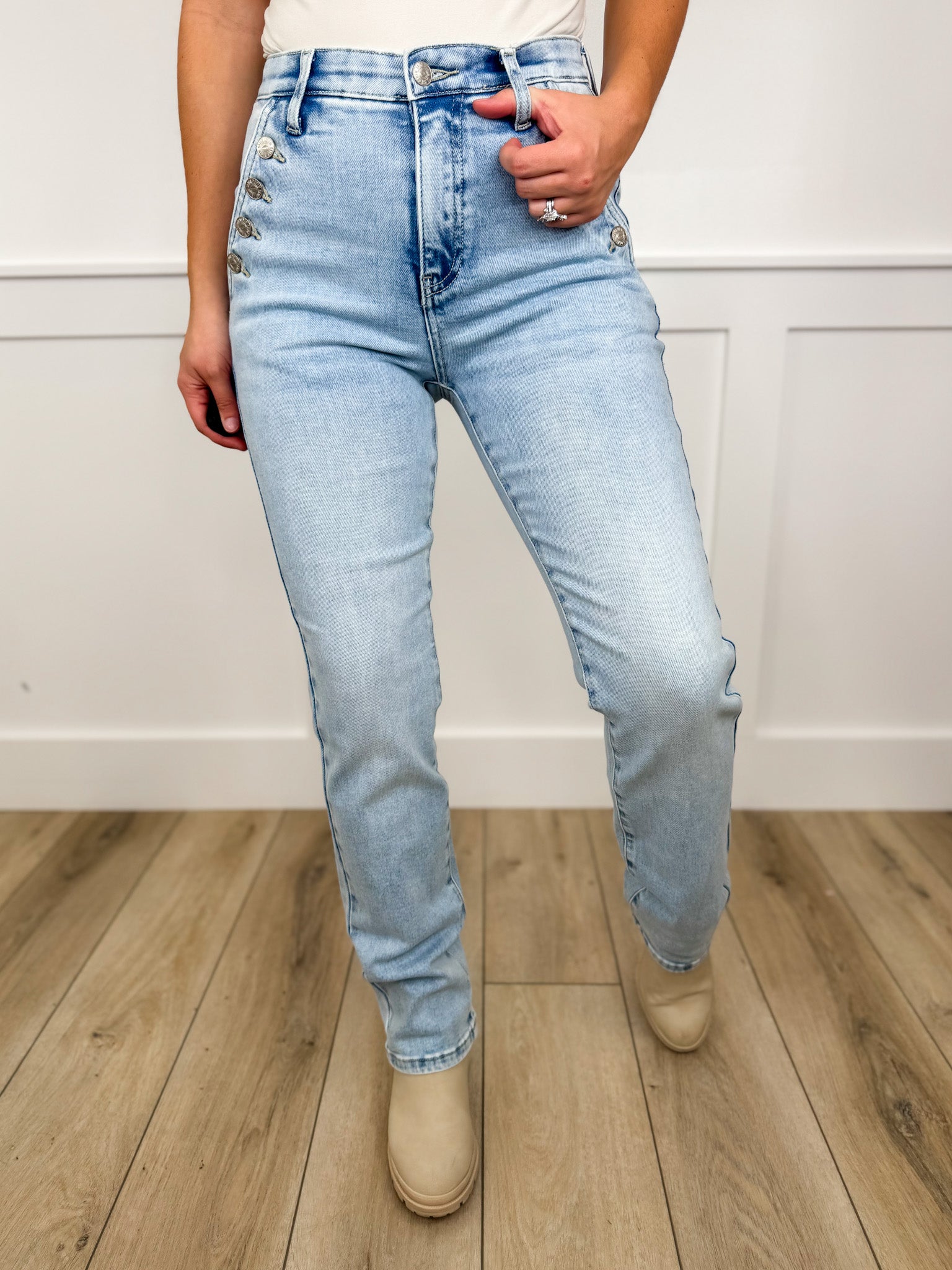 These Braylen high-rise jeans blend classic style with a playful twist. Featuring a light wash and straight-leg cut, they’re effortlessly cute and comfortable. The button-up front pockets add a charming detail while providing practical storage. With tummy control design, they offer a flattering fit that keeps you confident all day long. Perfect for mixing and matching with your favorite tops for an easy, stylish look.