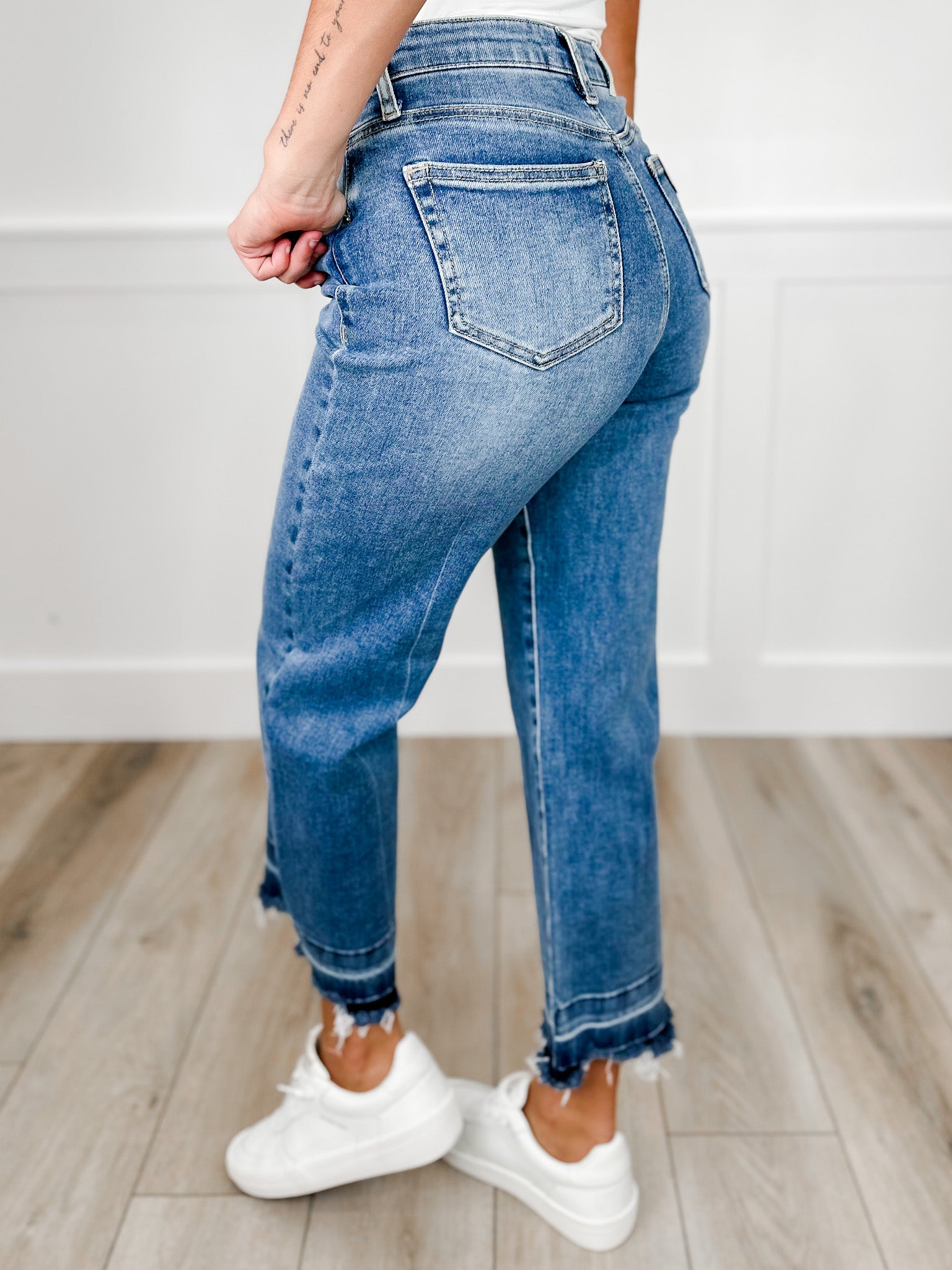 Introducing the Kinley—your new go-to for effortless style! These high-rise wide-leg jeans feature a flattering tummy control panel that keeps you comfortable all day long. The released fray hem adds an edgy, on-trend vibe, while the medium wash with light wash contrast detailing brings dimension and visual interest.