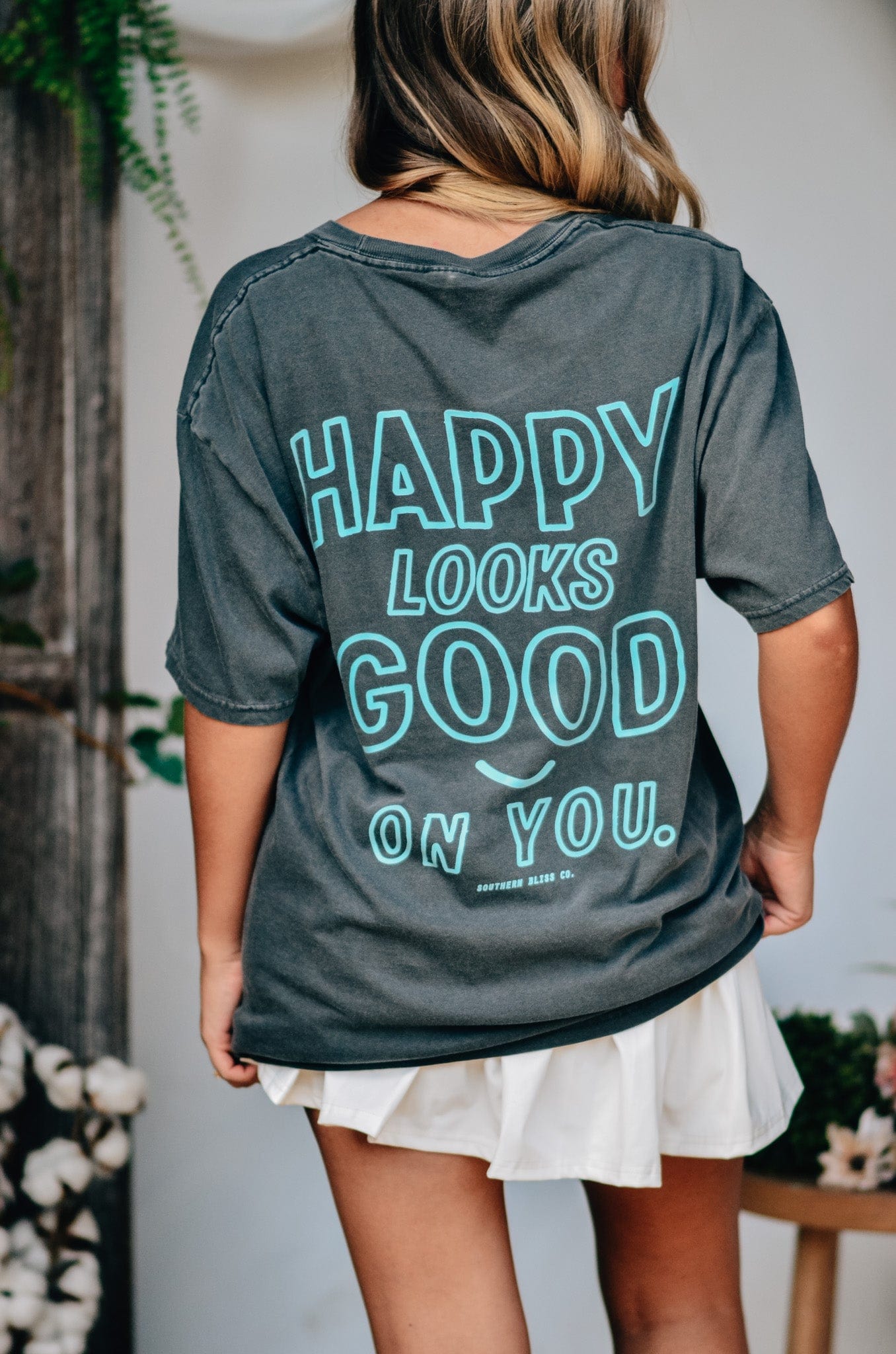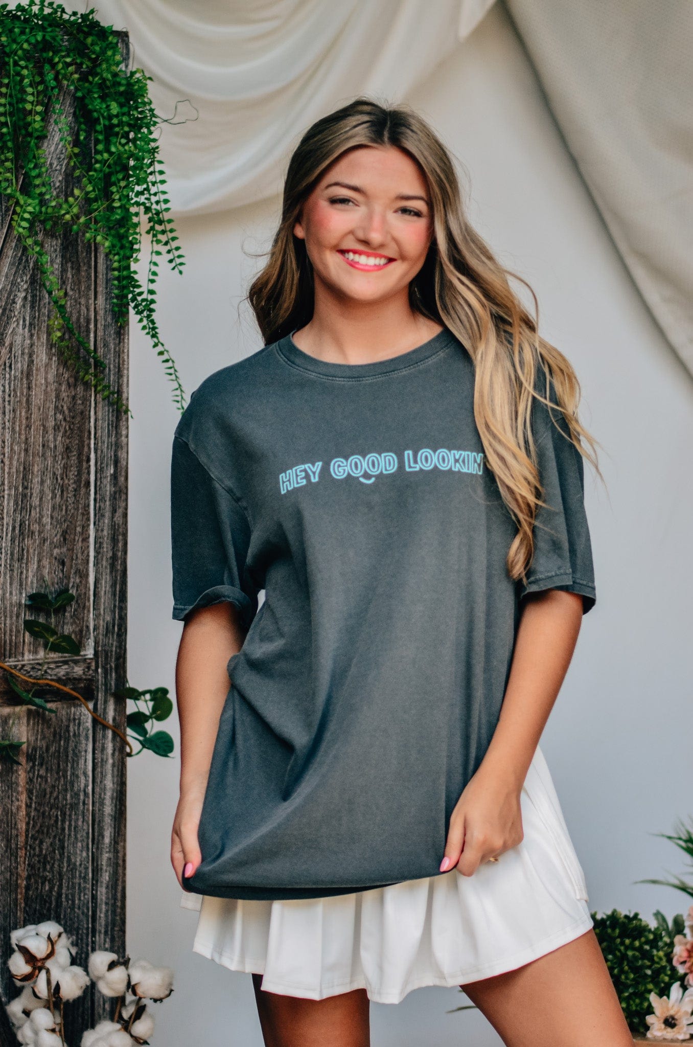 A classic tee with a cheeky twist, this "Hey Good Lookin" Comfort Color tee is your go-to for effortless charm. Featuring playful front-and-back text in a vibrant turquoise pop against a washed charcoal base, it's made with ultra-soft, garment-dyed cotton for that perfectly lived-in feel. Whether you’re lounging or out and about, this tee says it all—happy looks good on you.